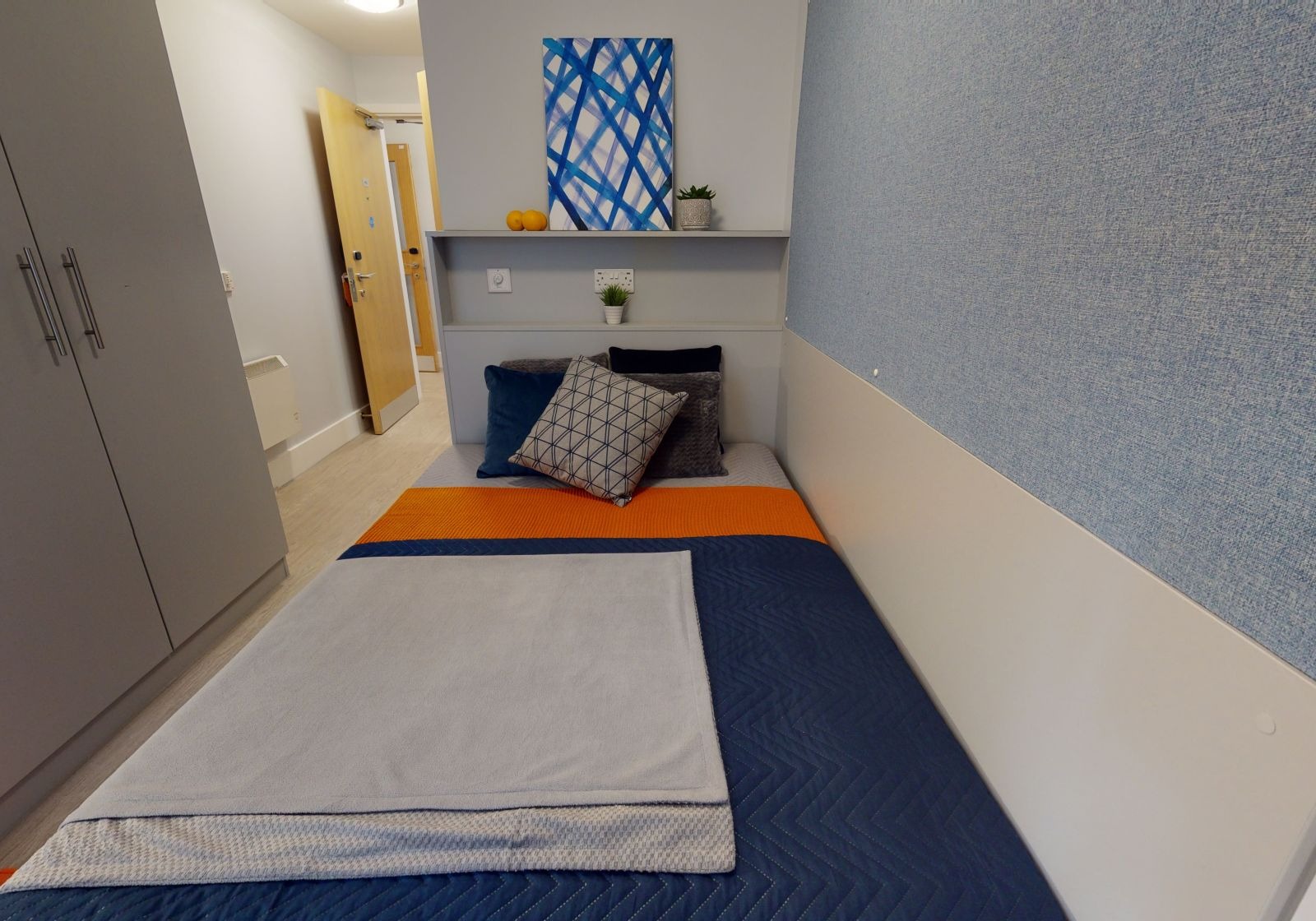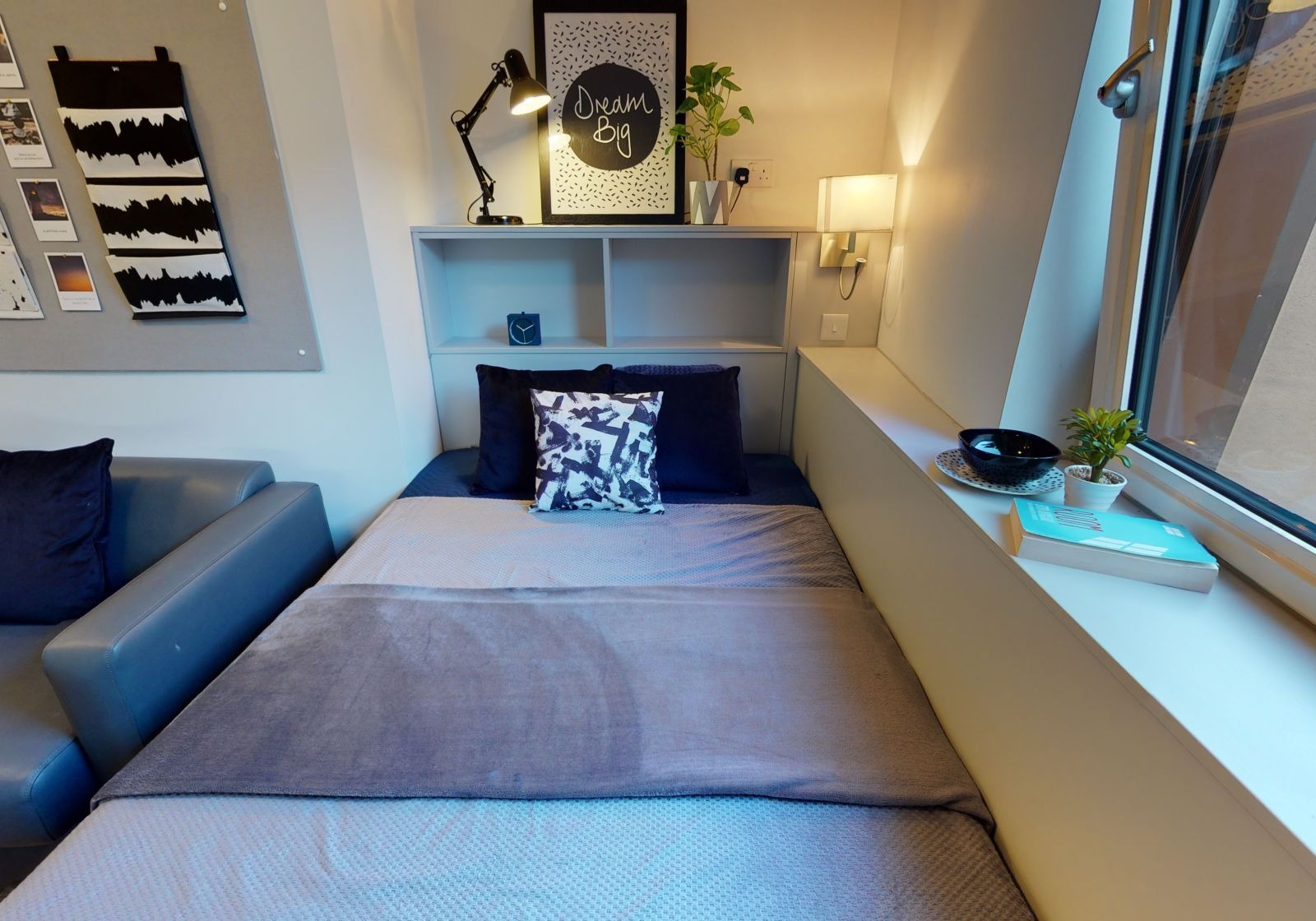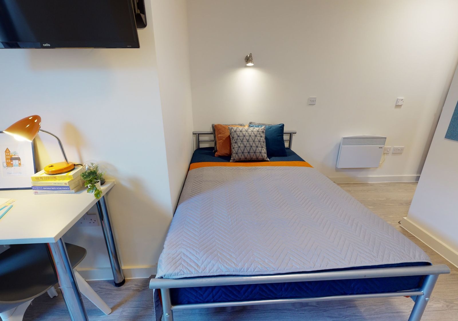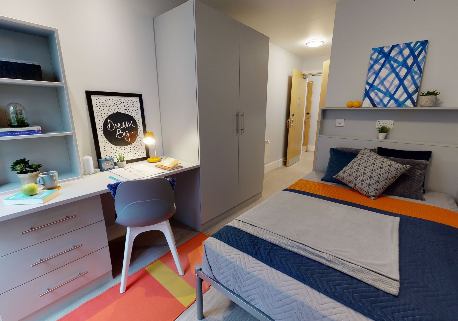MAGE200-031125If you’re looking for a bit more room to stretch out, our Silver En Suite gives you a bigger floor plan than the Bronze En Suite Plus with essentials including a private bathroom and small double bed. You’ll share a spacious kitchen and living area with your flatmates, with designated storage space for each person. Your 16 sq m room includes modern desk and study chair and storage, and with building perks including a free gym, social space and regular free treats, you’ll have everything you need for a great life at uni.