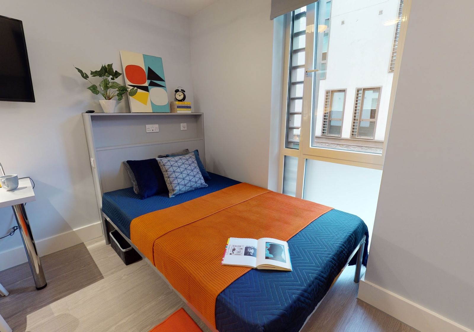 MAGE200-031125Located on the ground to fifth floor, these 13 sq m rooms have a fresh look and feel, and provide all you need in a convenient location. Your room comes with a small double bed, study area and storage, as well as an en suite shower room. You’ll share a spacious kitchen and living area with your flatmates, complete with TV and seating.