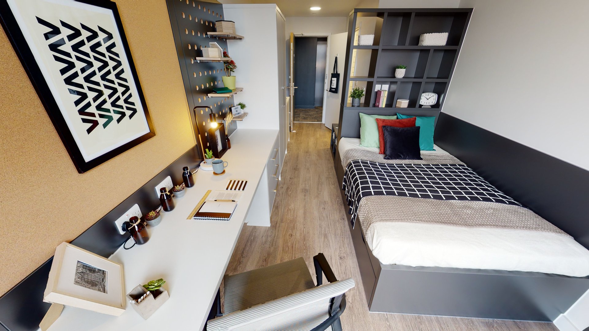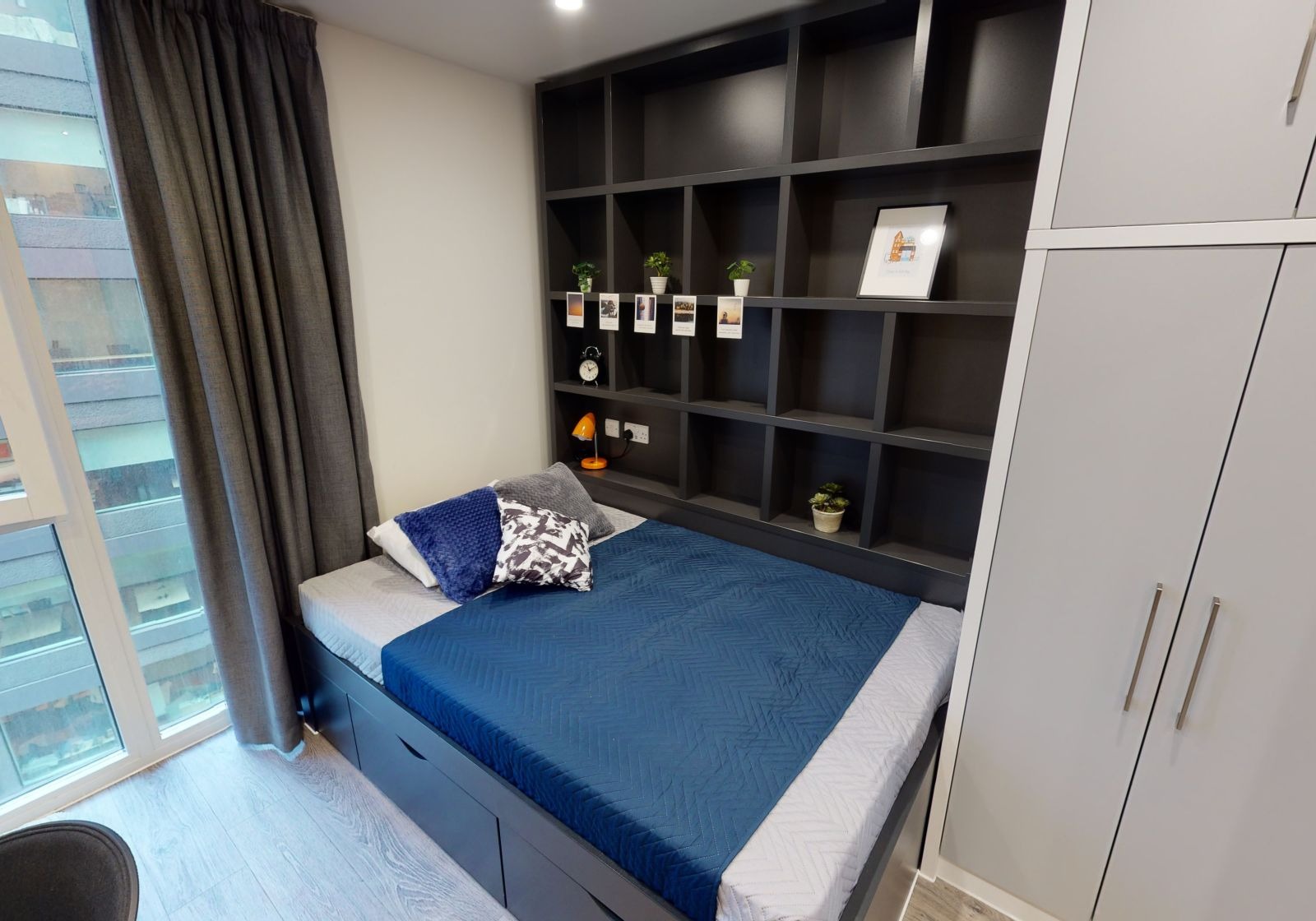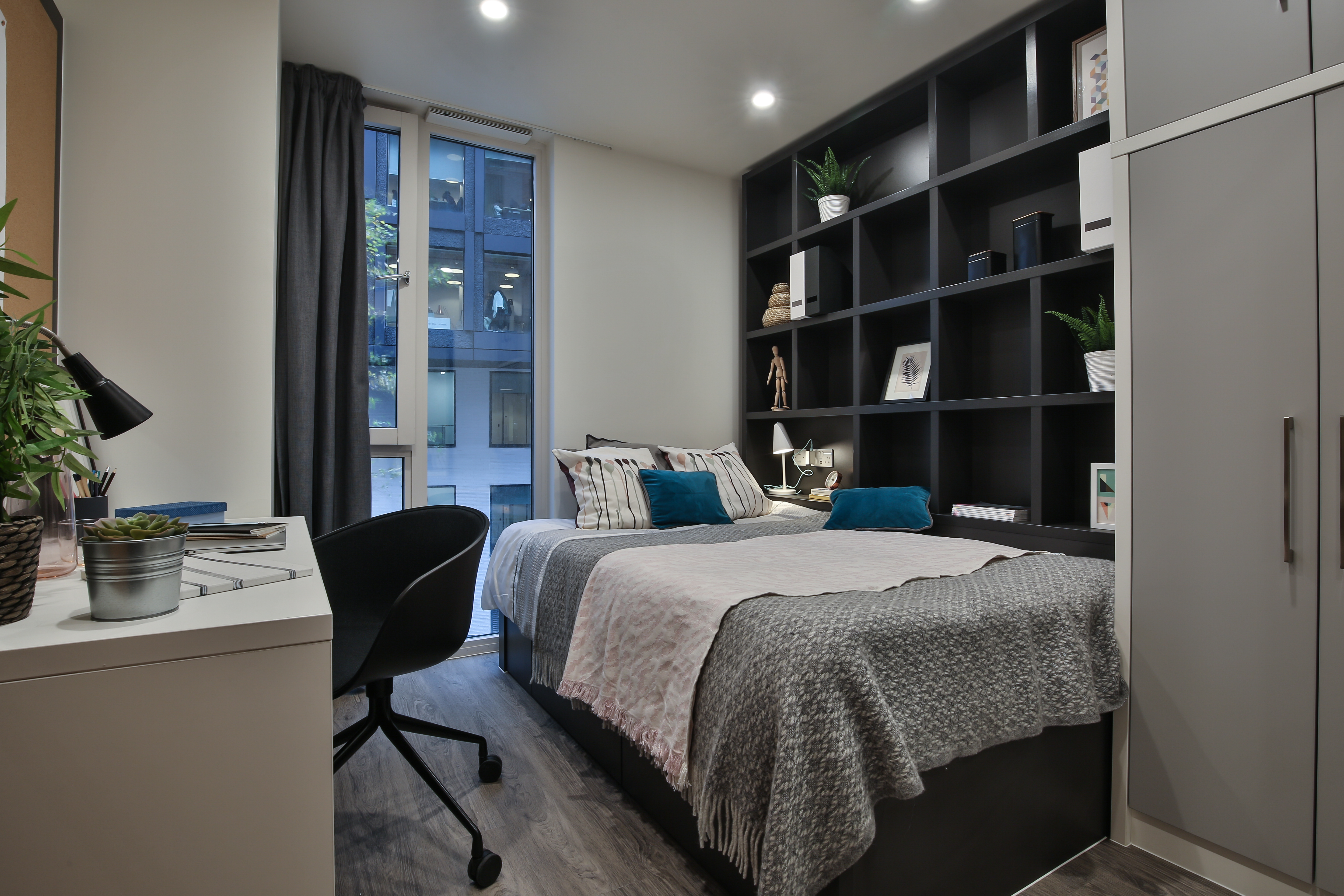 SHOR400-031125In the Two Bed Apartment Plus, you will have your own modern bedroom with a small double bed and study space, whilst sharing a bathroom, well-equipped kitchen area, a comfy seating area and breakfast bar. Take a look further down the page to see more of the Two Bed Apartment great features. Located on floors 7-9, enjoy city views with a friend or relative in your own 9-11 sq m well-formed room, sharing the kitchen and bathroom.