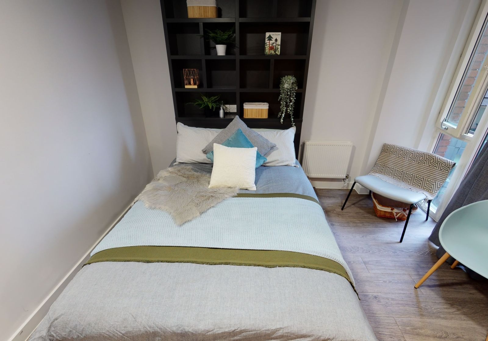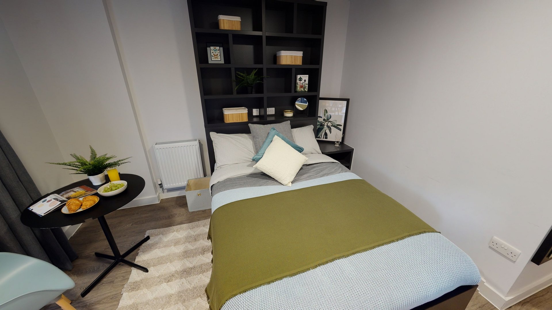 SHOR400-031125In the Two Bed Apartment, you will have your own modern bedroom with a small double bed and study space, whilst sharing a bathroom, well-equipped kitchen area, a comfy seat and coffee table. Take a look further down the page to see more of the Two Bed Apartment great features. Located on floors 1-6, share with a friend or relative in your own 9-11 sq m well-formed room, sharing the kitchen and bathroom.