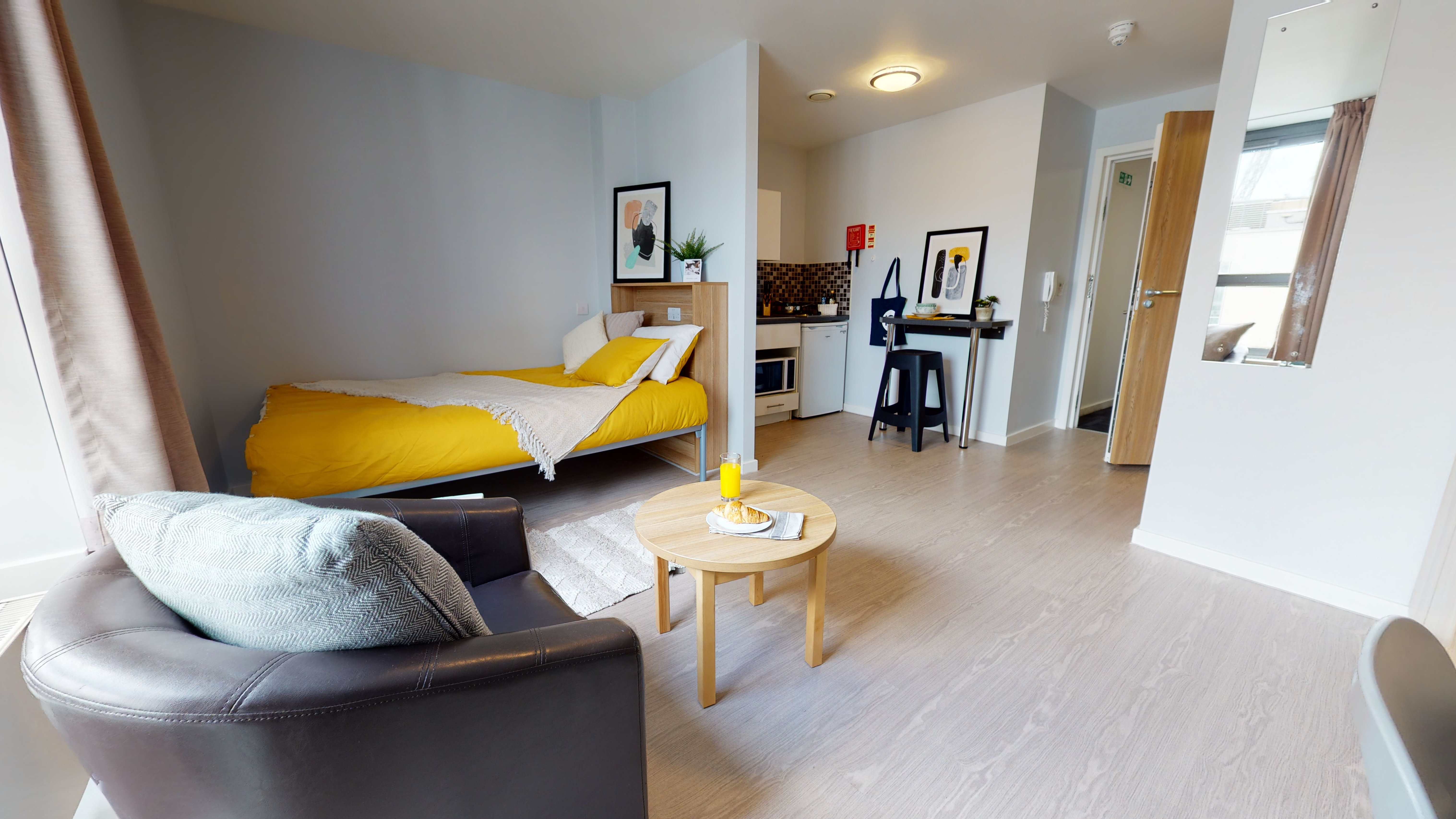 STER350-031125Our modern entry-level rooms in Sterling Court are great value for money, giving you value and comfort with your own bathroom and double bed. Your room comes with lots of storage, hardwood floors and a bright, modern feel. Sharing a stylish open-plan kitchen and living room with breakfast bar, stools, sofas and essential cooking facilities with up to 5 others, you get the best of both worlds. The building also features a laundry and a social space with pool table.