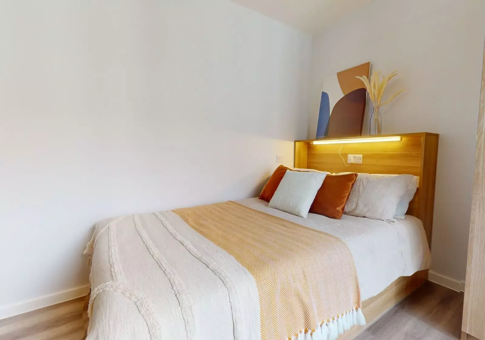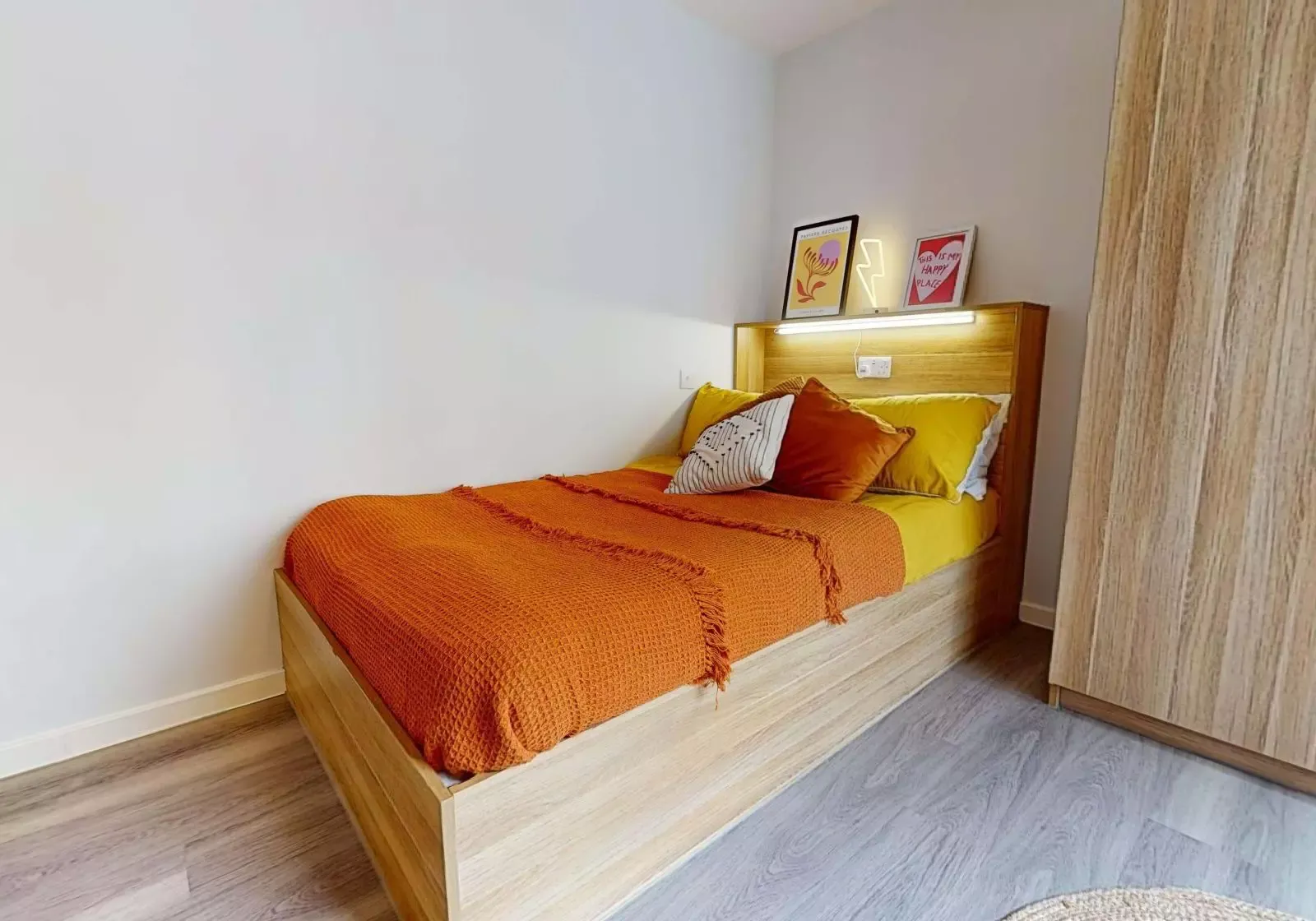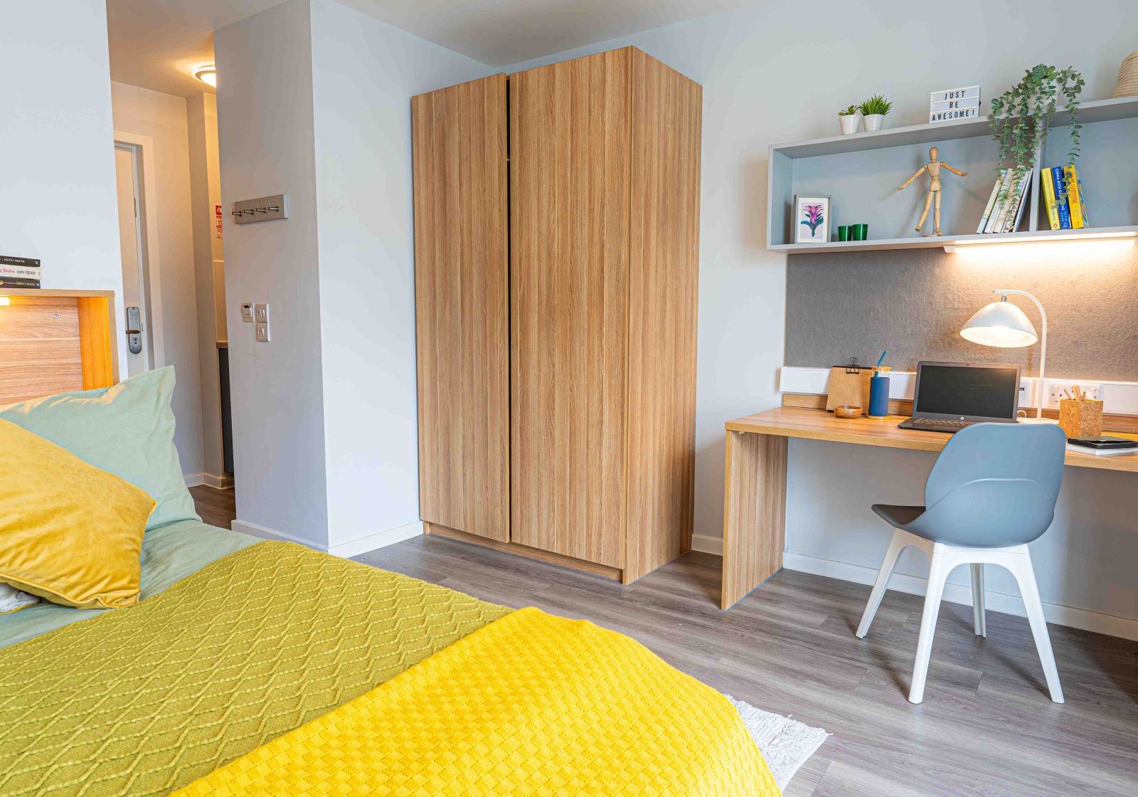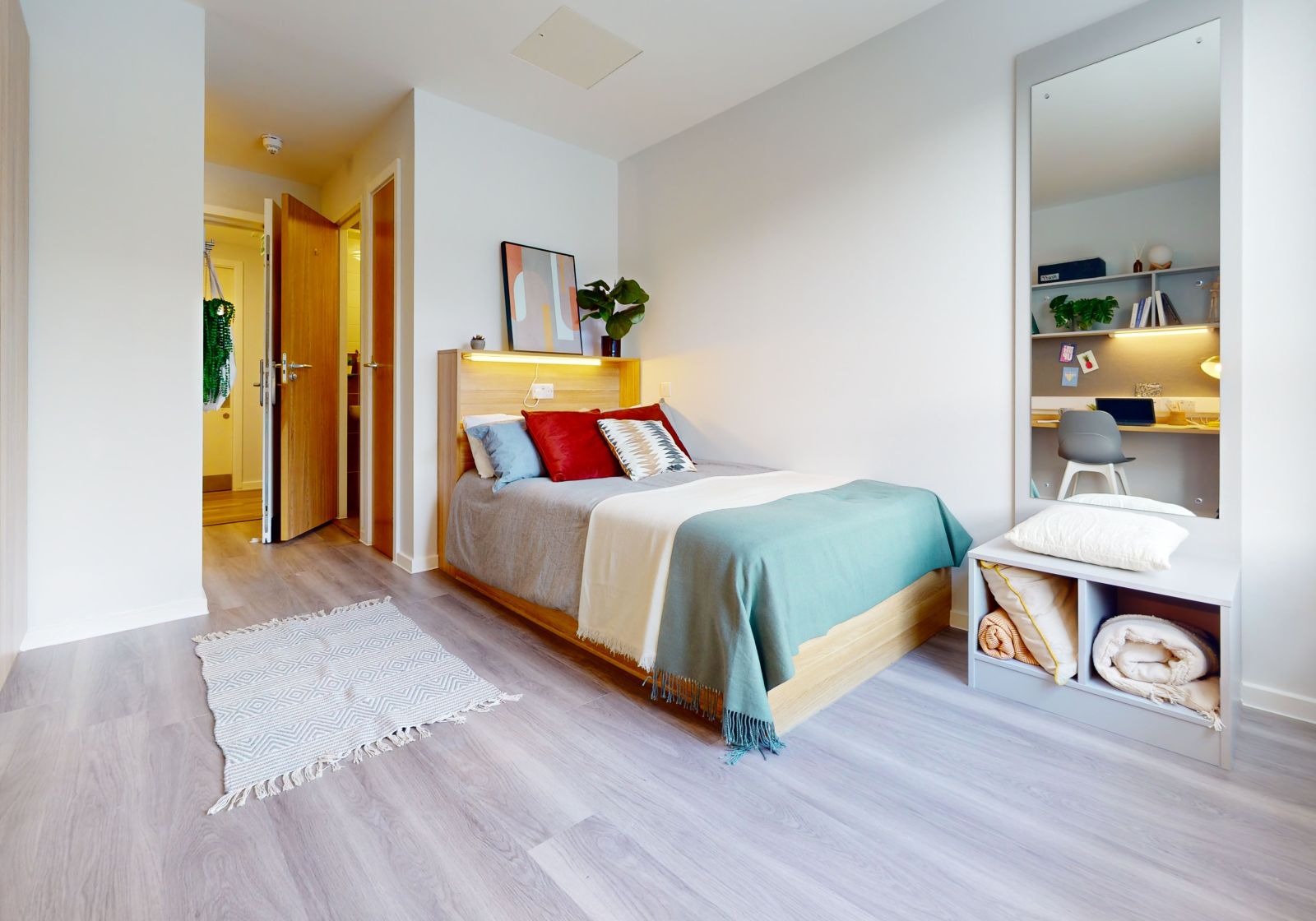 STER350-031125Your room comes with lots of storage, hardwood floors and a bright, modern feel. Sharing a stylish open-plan kitchen and living room with breakfast bar, stools, sofas and essential cooking facilities with up to 5 others, you get the best of both worlds.
