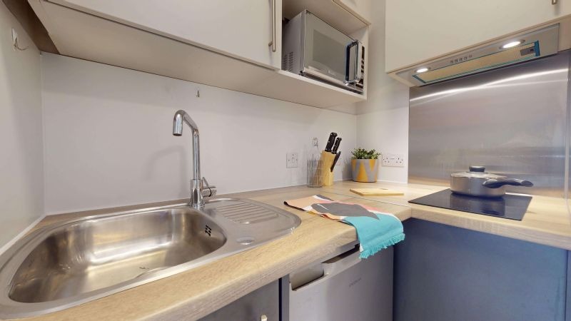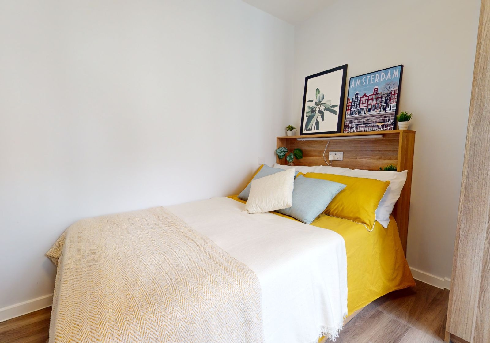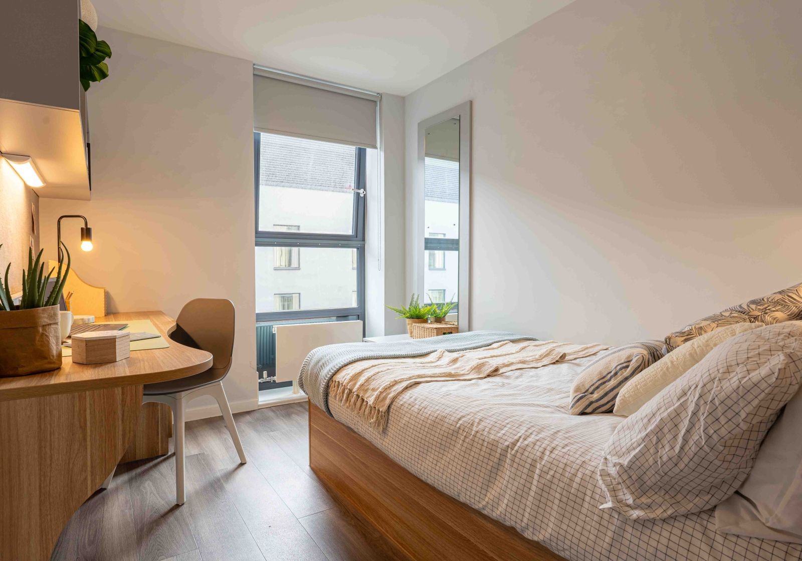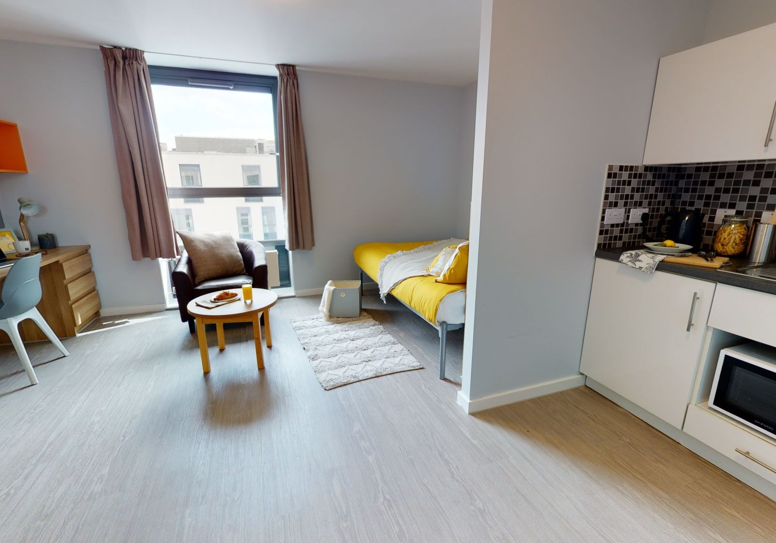 STER350-031125Your room comes with lots of storage, hardwood floors and a bright, modern feel. Sharing a stylish open-plan kitchen and living room with breakfast bar, stools, sofas and essential cooking facilities with up to 5 others, you get the best of both worlds.