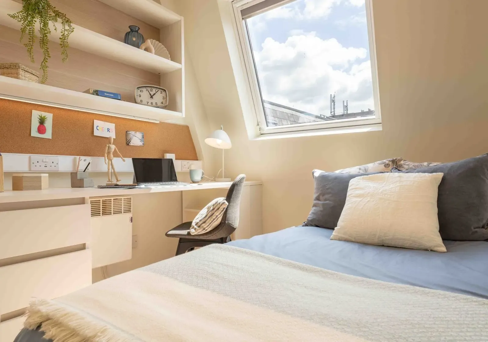 If you’re admitted to the London Metropolitan University, iQ The Arcade accommodation will be the perfect place for you, being just across the road from it. Also, let’s not forget how living closer to campus also helps cut the commute. So, you can sleep in a little bit longer each day! The rooms are designed to provide optimum comfort. Each room at the iQ The Arcade student accommodation is equipped with a large bed, ensuring you’re always well-rested. Alongside, you’ll also have a study area that comes with a chair and a desk.
