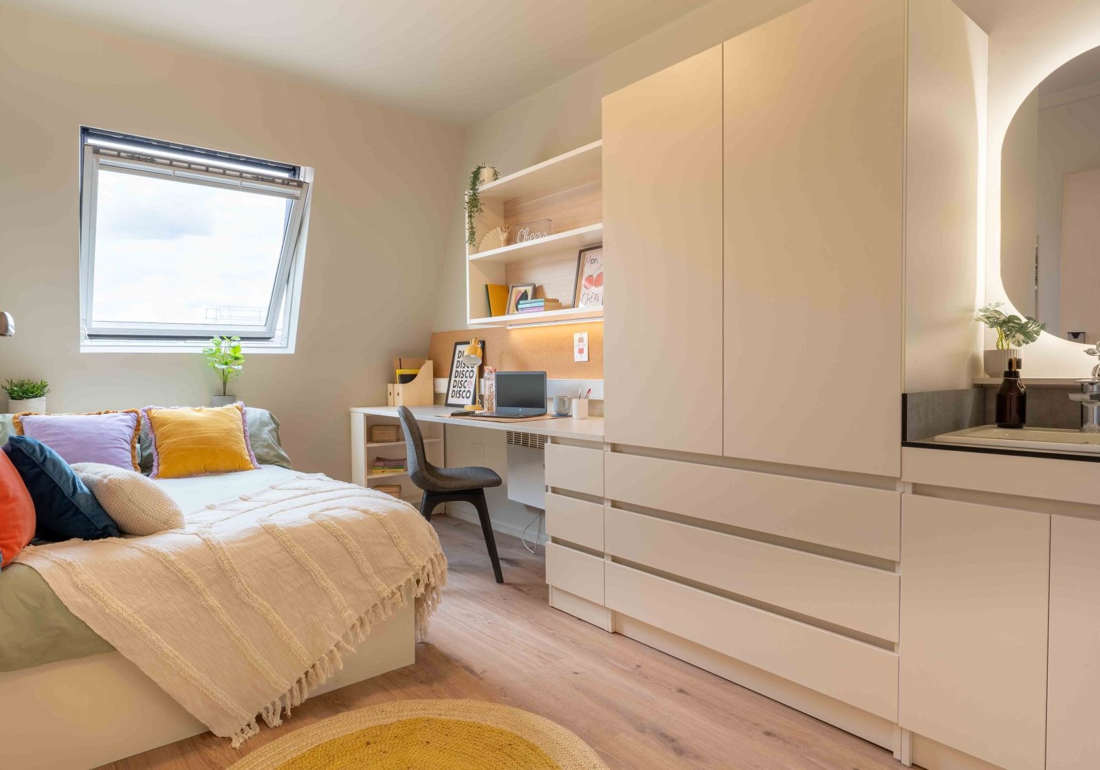 ARCA750-130825Giving you a bit more room than our standard offering with a double bed and sink, our Platinum Room offers a little extra. You’ll share a well-equipped kitchen and wetroom with two others, and with regular social events in the building, you’ll have lots of chances to meet the other 370 students in the building and make new friends.