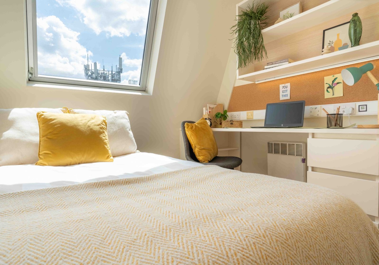 ARCA750-130825These Gold Rooms feature a comfy single bed, a wardrobe, drawers and shelves with lots of storage space and a study desk and chair. You’ll share a well-equipped kitchen and an additional bathroom with four others, and with regular social events in the building, you’ll have lots of chances to meet the other 370 students in the building and make new friends.