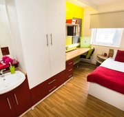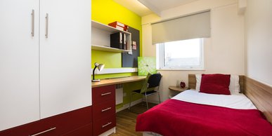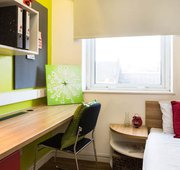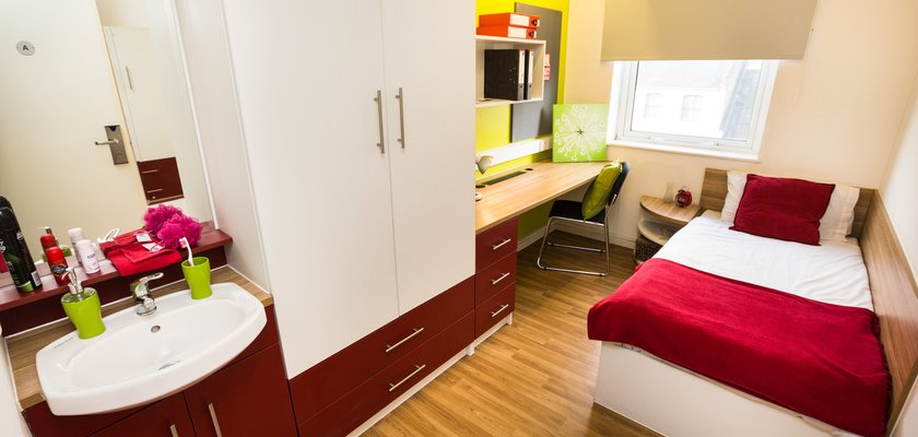 ARCA750-130825These Gold Rooms feature a comfy single bed, a wardrobe, drawers and shelves with lots of storage space and a study desk and chair. You’ll share a well-equipped kitchen and an additional bathroom with four others, and with regular social events in the building, you’ll have lots of chances to meet the other 370 students in the building and make new friends.