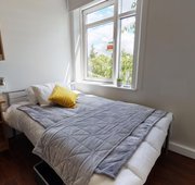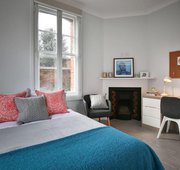 TUFN350-031125Each of these three rooms has been carefully renovated in contemporary style, with wooden floors and stylish furniture. Included are a double bed, a study area with desk and chair and lots of storage. Original features include the big windows and the (non-working) fireplace in one of the rooms. The three residents of these great rooms share a big kitchen and living space with a sofa, and also get to use the main building’s gym and laundry. Housed in the separate Gatehouse building at Tufnell House, three of these excellent 14 sq m en suite rooms are available as part of a shared house with a private garden.