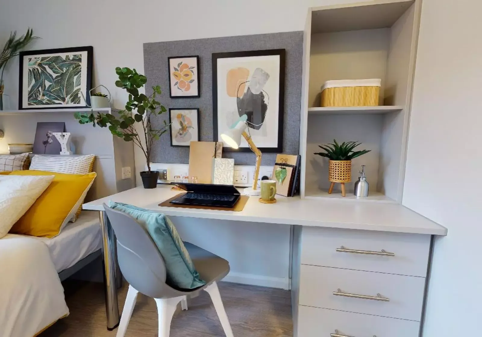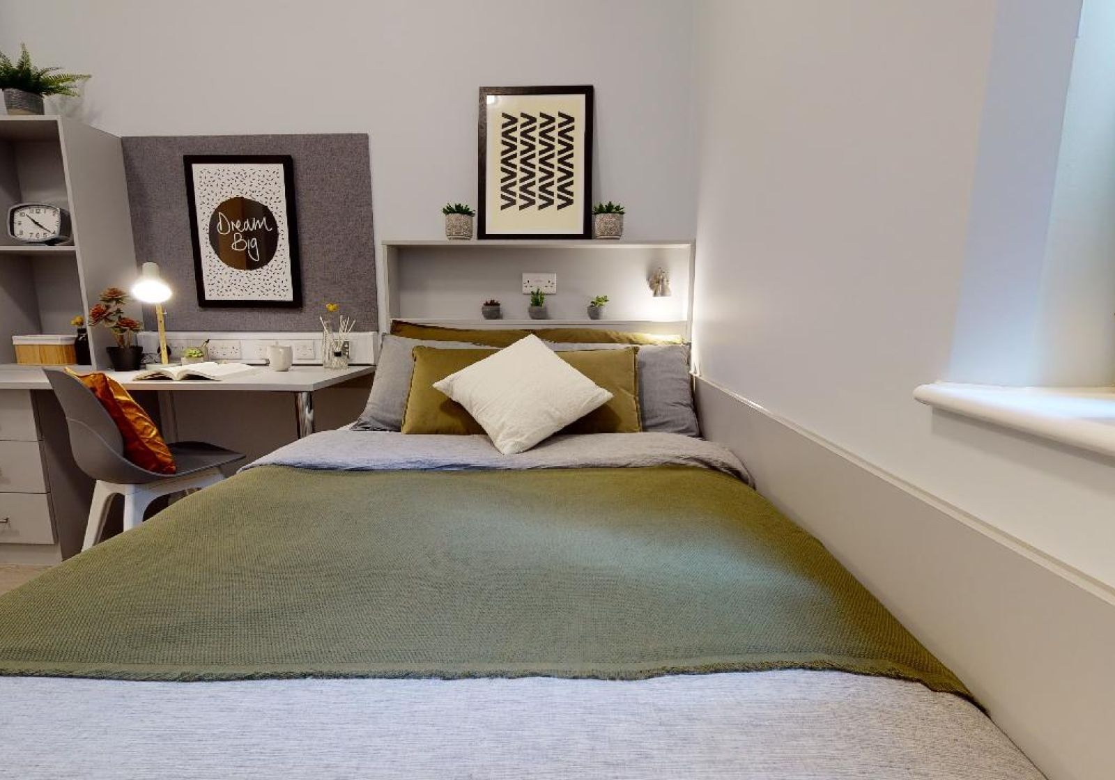 WILL200-031125Twice the size of a standard Bronze En Suite at 23 sqm, this room features an accessible shower, a small double bed and study area. This room on the ground floor is suitable for those requiring wheelchair access. You will also be able to enjoy the brand new onsite facilities. Our building is located close to a range of useful amenities, with many shops and restaurants around five minutes away. Your room has a large en suite shower and has been upgraded with USB charging points. It also shares a kitchen space plus TV and seating area with other students. You will also have the use of a courtyard, laundry facilities and free WiFi.
