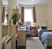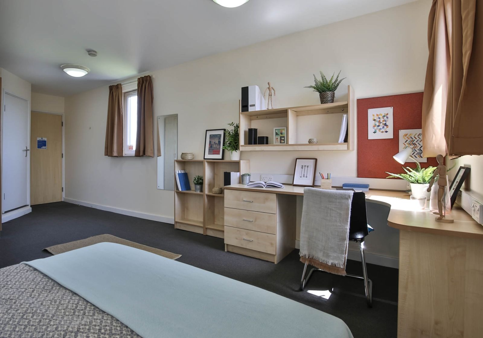 Private room Single bed Fully accessible Private bathroom With wheelchair access, this room is twice the size of our standard Gold En Suite and located on the ground floor of the building. You have an accessible shower, single bed and study area, and the use of a shared kitchen and living space.