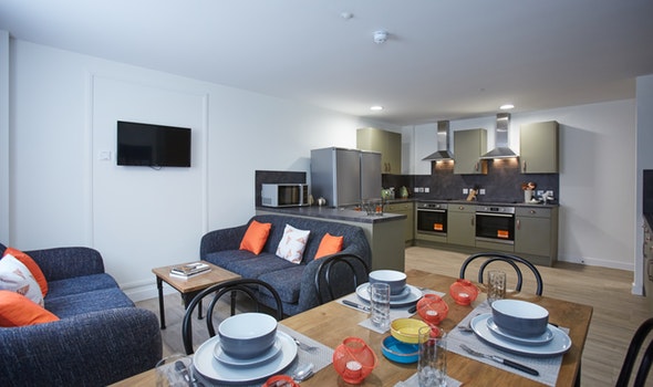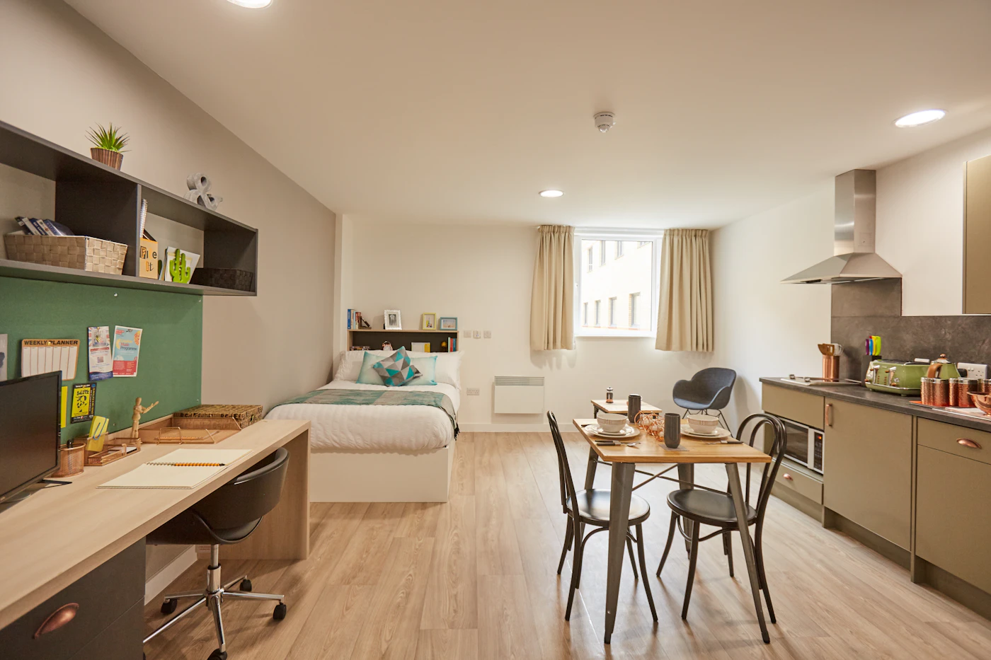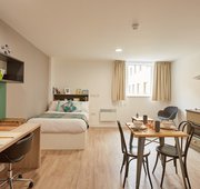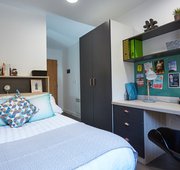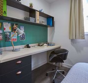 3/4 (small double) bed Desk, chair and wardrobe provided in room Ensuite bathroom with shower, toilet and basin Self-contained kitchen, bathroom and living space