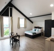 Self-contained kitchen, bathroom and living space with large screen TV Approximately 44.75m² Double Ottoman Bed Double wardrobe, personal study space with desk and chair, kitchen and ensuite bathroom