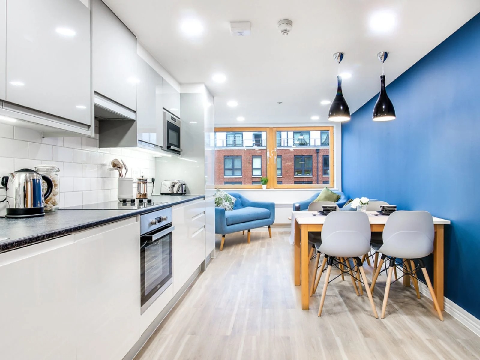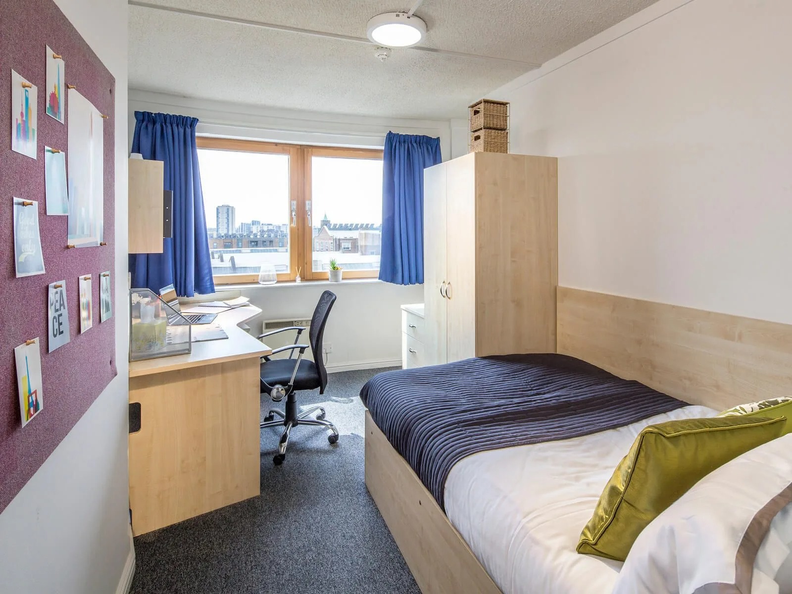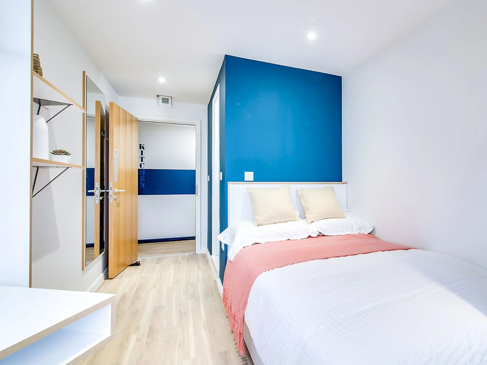 Exactly the same as our other en-suite rooms, but quieter as youll be sharing the flat with just one other person. Enjoy this stylish en-suite bedroom, equipped with a queen size bed, study area and bags of storage space. Get super social in the shared kitchen and living space.