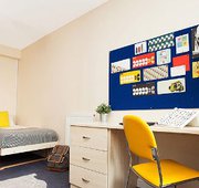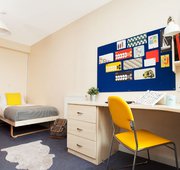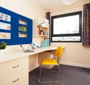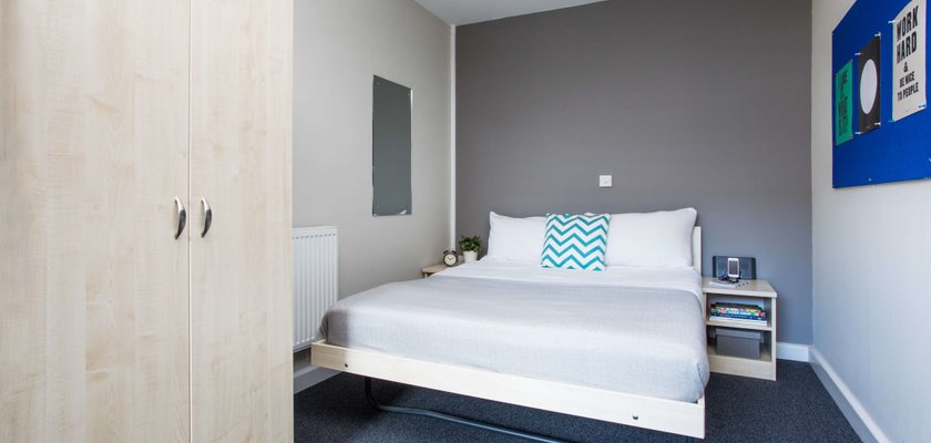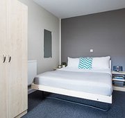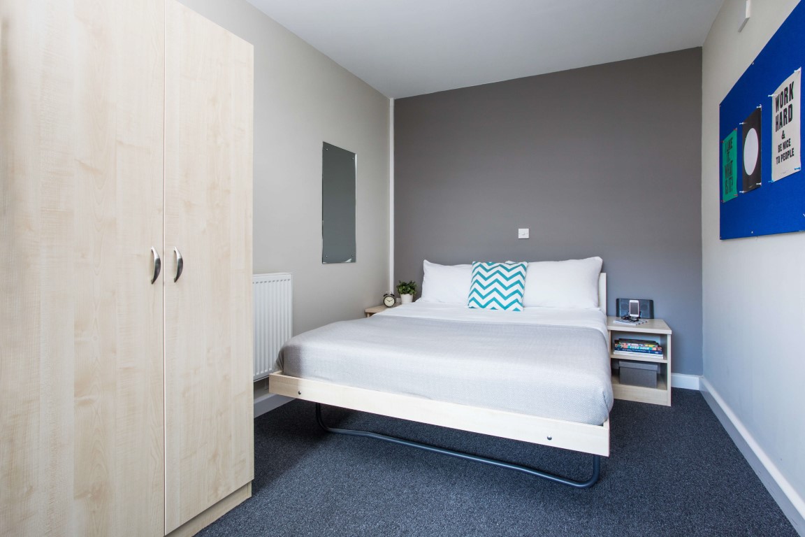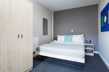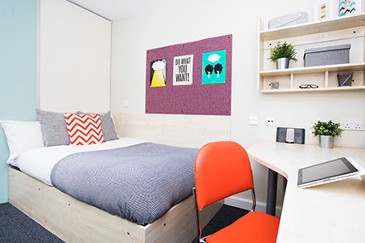 A 24m2 self-contained accessible studio featuring a comfy double bed with under-bed storage, a fully-fitted kitchen with dining area, a Wi-Fi connected study area, ample storage, large wardrobe, drawers and shelves.