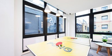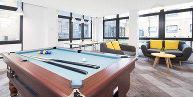 The common room at Pacific Court accommodation London has sofas, TV, and a free-to-use pool table while the vending machine provides snacks and drinks for a quick pick-me-up.