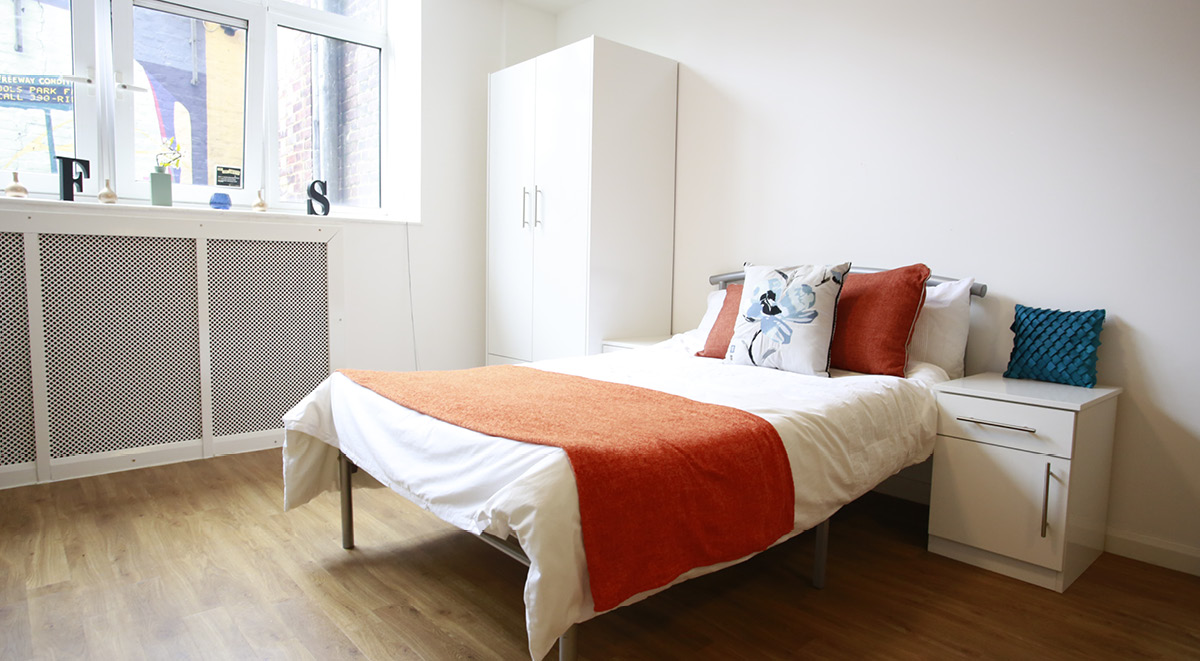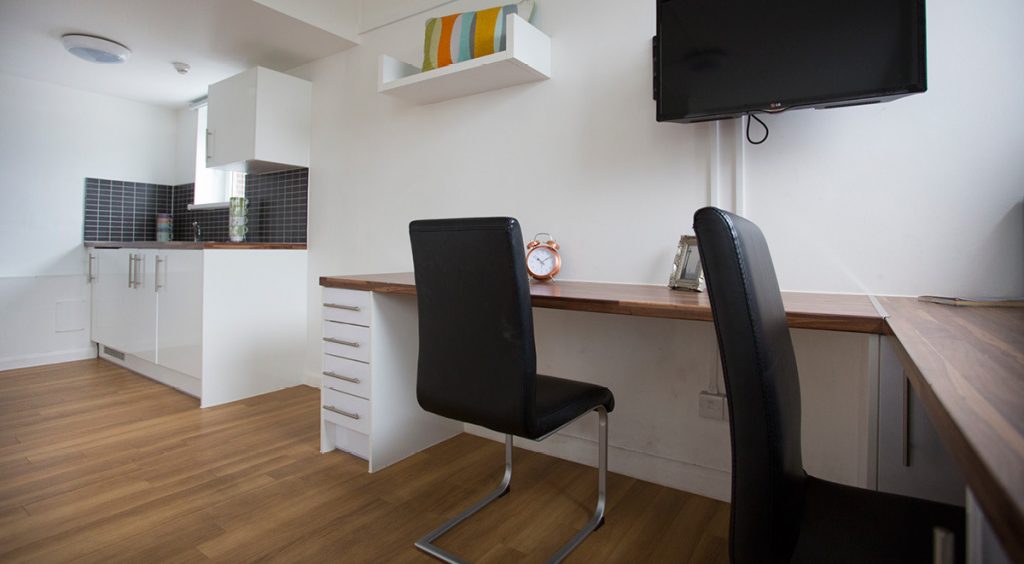 Everyone loves having their own personal space, so why not have bags of it? Our Self-contained Deluxe Studio measures 22m² with fabulously large windows to create that fresh, chilled vibe. Sink into your 3/4 bed after a tough day at university and catch the soaps on your very own TV! With the comfort of your own en suite and snazzy fitted kitchenette, you’re bound to feel right at home in no time! Surf the web with your 100Mpbs WIFI and crack on with your studying at your very own desk.