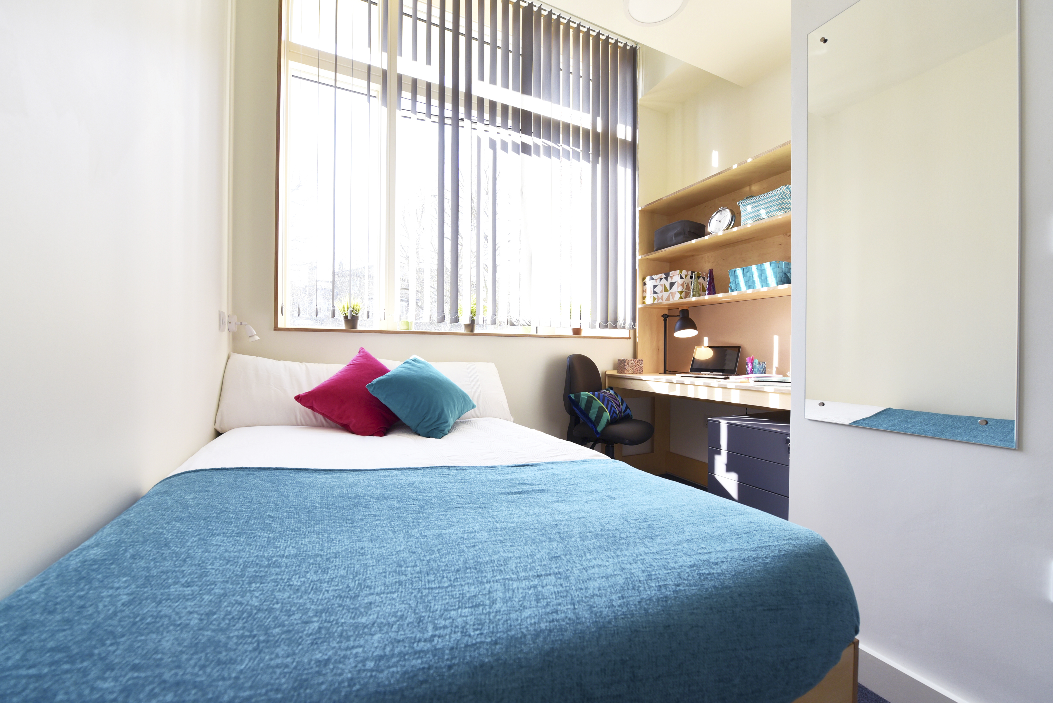 The biggest of the rooms, offering a luxurious living area with extra floor space. Not only do you have a private bathroom, you also benefit from a large wardrobe and comfortable small double bed with storage space underneath, plus a spacious desk and shelves to help you complete your assignments.