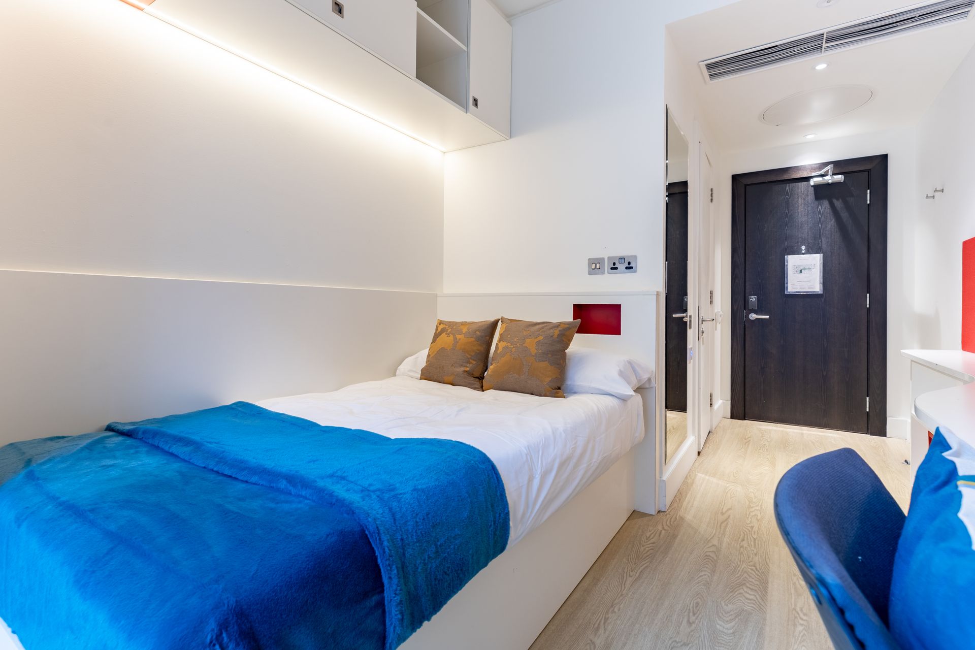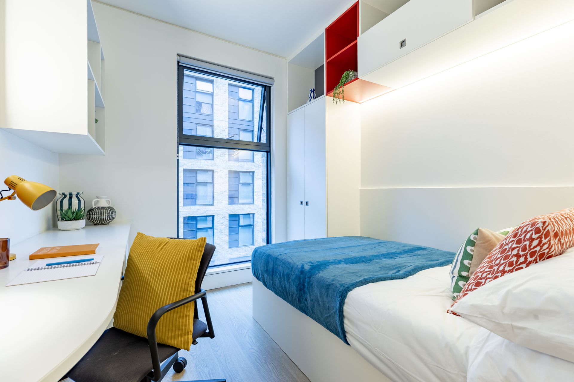 All the features you love from our Silver En Suite, but with extra space and some of the best views in the building. Your small double bed, private en suite, and storage keep things practical, while the shared kitchen and social areas keep life fun. Council tax band B or E. Room size: 12.7 – 19.7 sqm. Council Tax Band B or E.