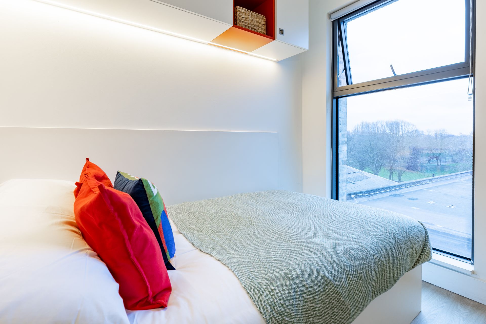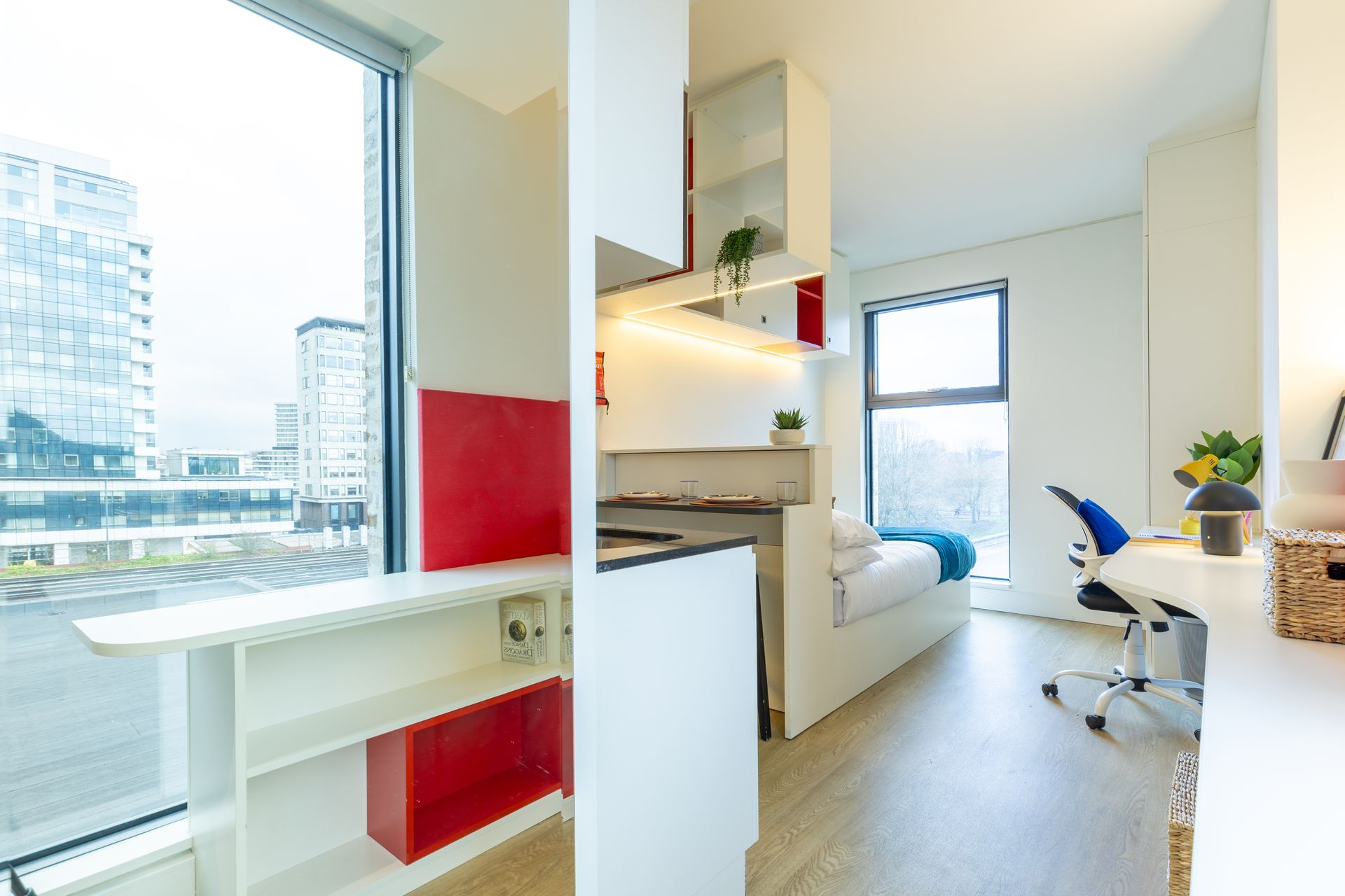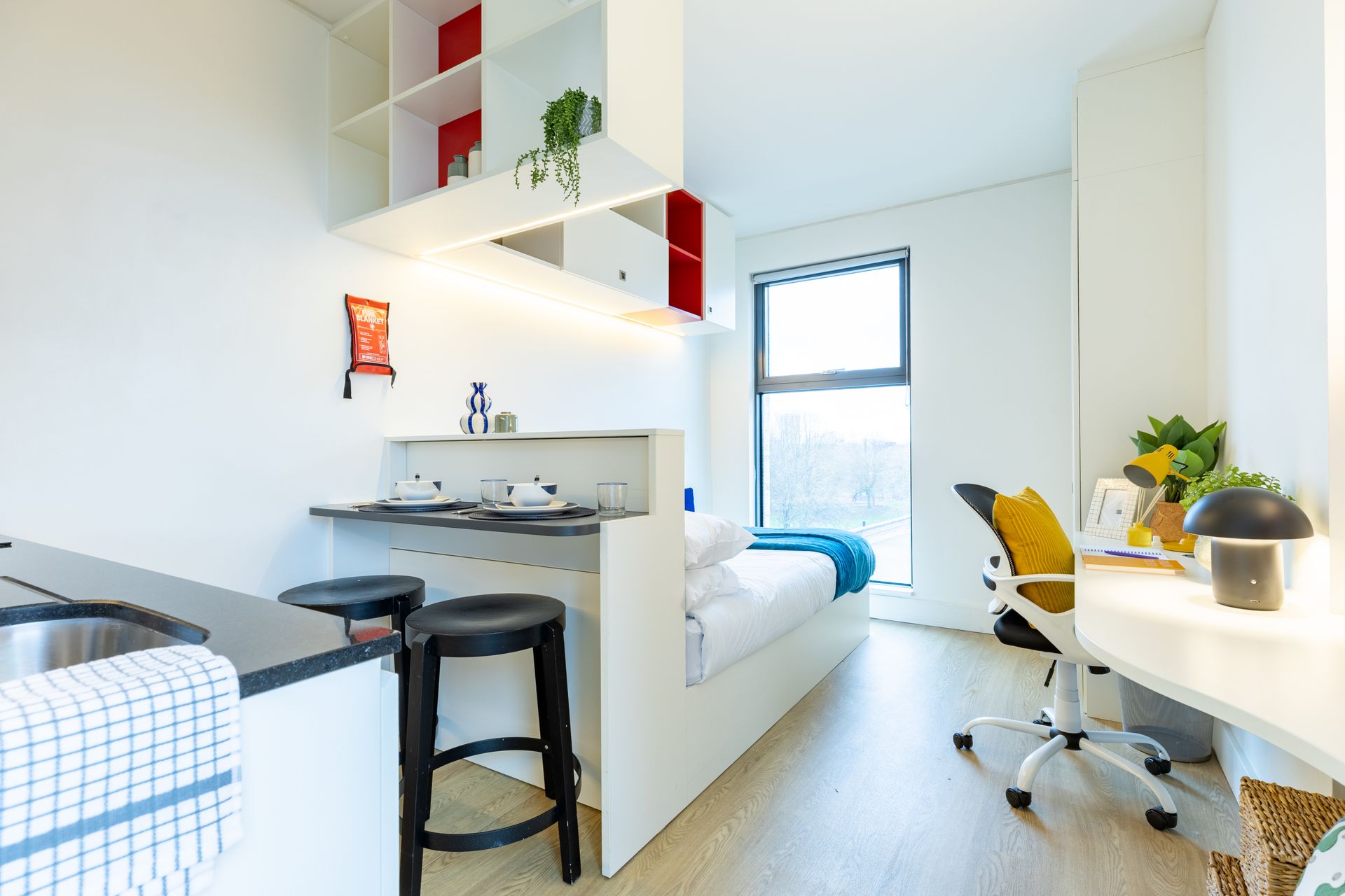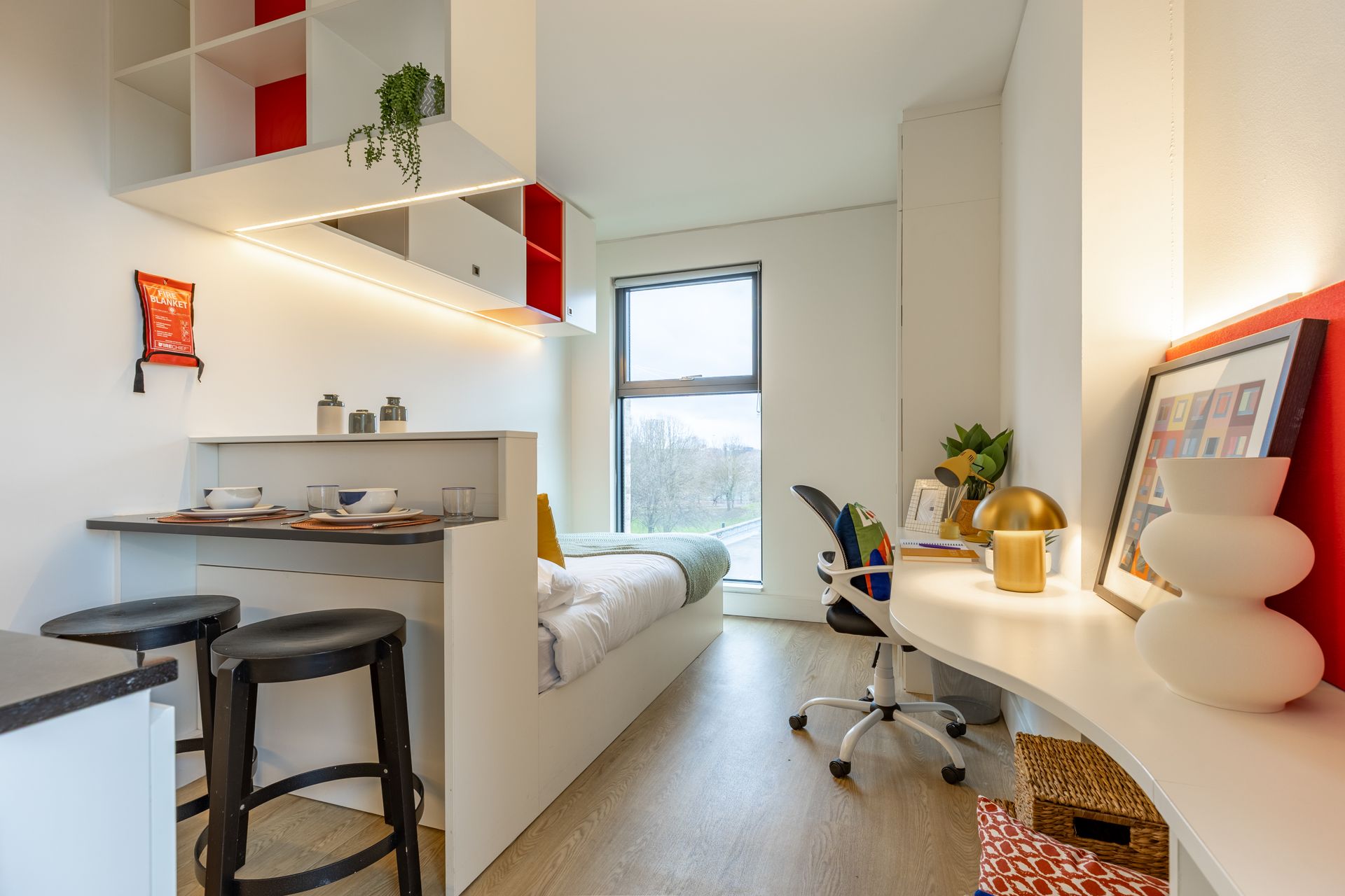 Our most spacious studios, with standout views and room to breathe. You’ll have a small double bed, en suite, fitted kitchen, storage, and a comfortable study space. It’s everything you need, right where you want it. Room size: 17.1 – 19.5 sqm. Council Tax Band B or E.