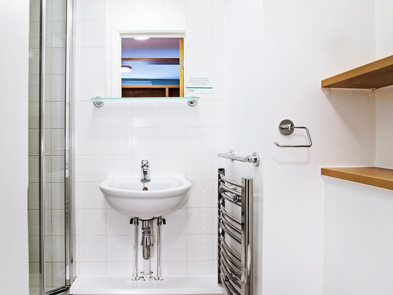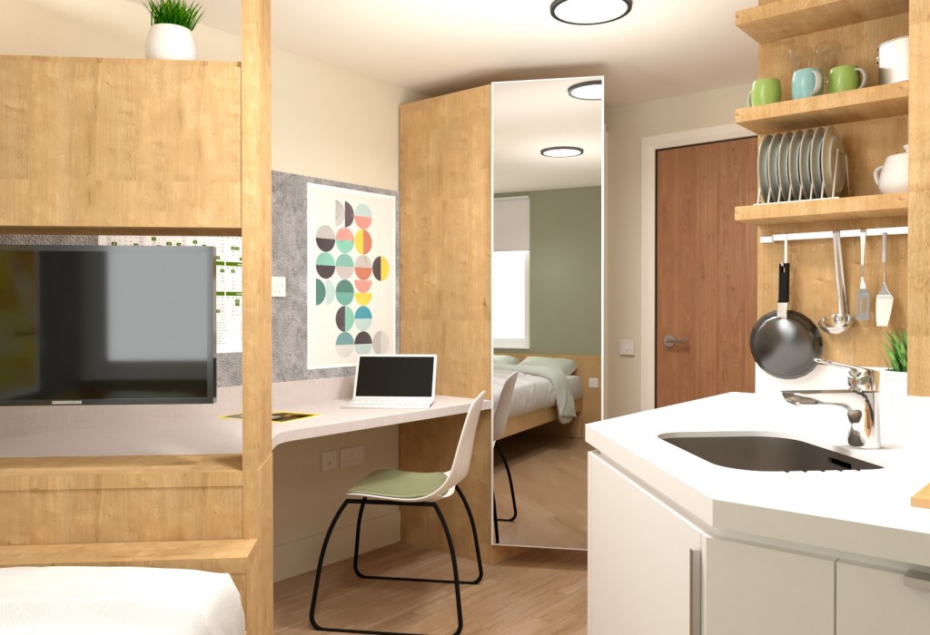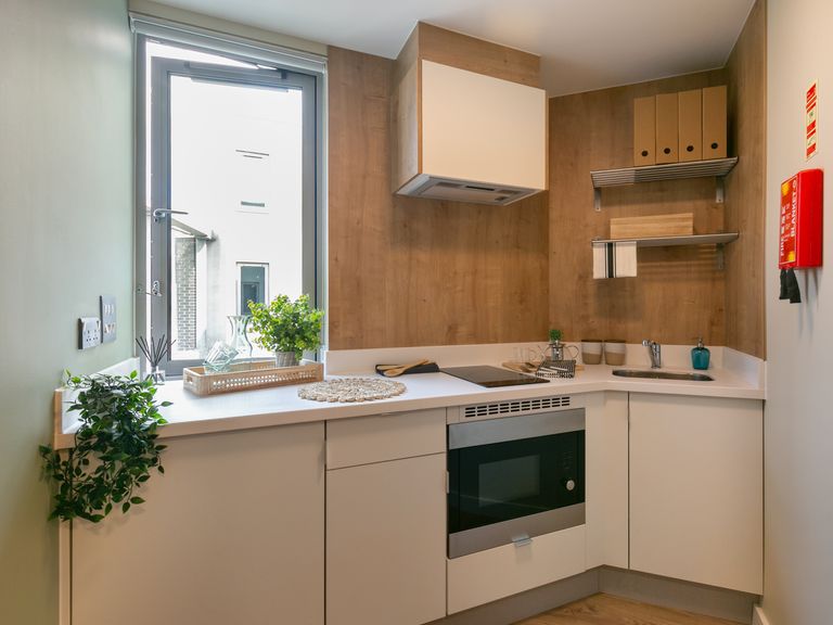 Single bed with under-bed storage and bed lamp, TV monitor, desk with chair and lamp, shelving, a small cupboard, and 2 drawers, wardrobe. Your very own small kitchenette with combination microwave/oven, 2-hob points with an extractor fan, fridge, sink and cupboard storage. Your own bathroom with a toilet, a sink, and a shower. Please note that some Large Studios are disability adapted with a larger, wet-room style bathroom.
