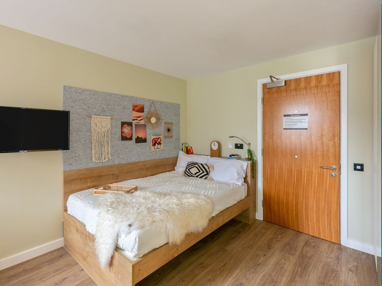Newly refurbished for September 2020. You'll have a small double bed combined with plenty of storage, space, and style for student living. Your own study space, state-of-the-art kitchenette, en-suite with a toilet, a sink, and a shower, all with views over the big city. These rooms range from 12-14.5sqm in size.
