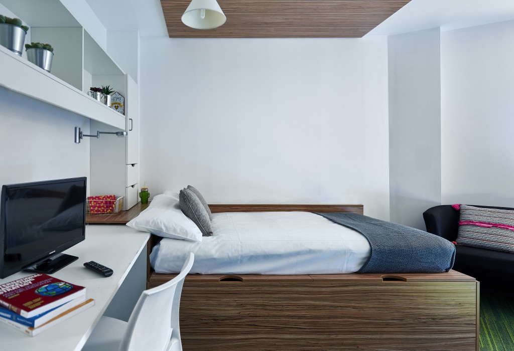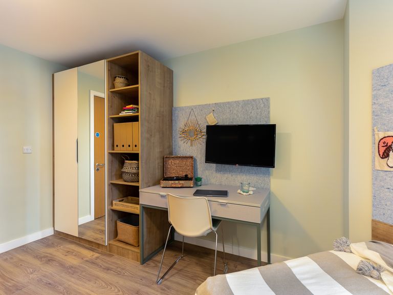 Newly refurbished for March 2020. You'll have a small double bed combined with plenty of storage, space, and style for student living. Your own study space, state-of-the-art kitchenette, en-suite with a toilet, a sink, and a shower, all with views over the big city. These rooms range from 20-30sqm in size.