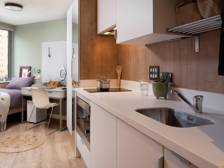 Newly refurbished for September 2020. Your double studio comes with a comfy double bed, plenty of storage, space, and style for student living. Your own study space, state-of-the-art kitchenette, en suite with a toilet, a sink, and a shower, all with views over the big city. The double studio is typically bigger than the standard studio, ranging from 13.5-17.5sqm in size.