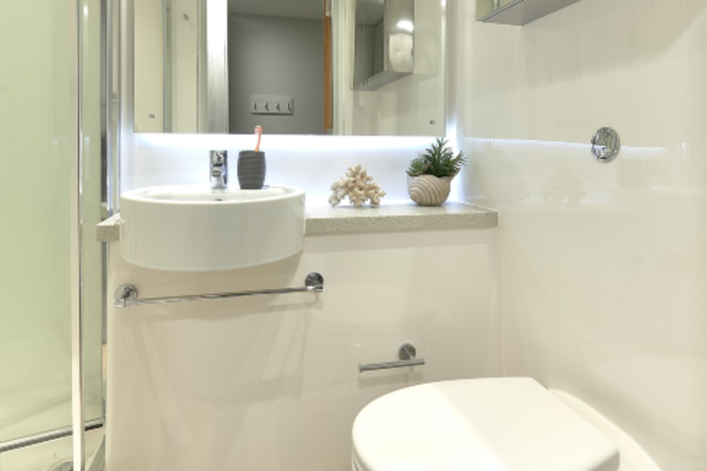 Designed for accessibility and comfort, the Accessible Studio is perfect for students who require extra space and convenience. Inside, you’ll find a ¾ size double bed with under-bed storage, a study area with two desks and chairs, a wardrobe, drawers, shelves, and a magnetic board. The kitchen, equipped with ceramic hobs, a combi oven, and a fridge freezer, also includes a dining table and chairs. The private en-suite shower room is designed for ease of use, while air conditioning and heating ensure comfort all year round.