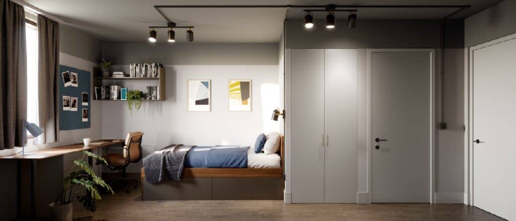 Room size- From 19-21m² 3/4 double bed Wardrobe, bedside table, drawers, coat hooks & underbed storage Large desk and chair Bookshelves & noticeboard Freeview TV