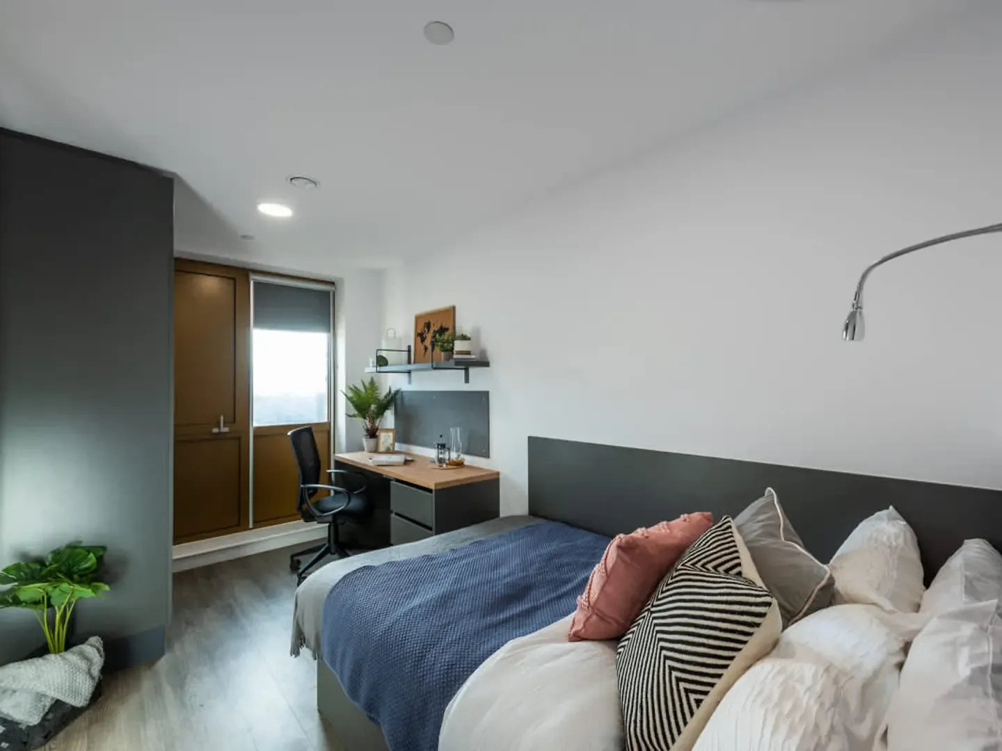 Room sizes may vary from 14.88m2 to 19.91m2 En- suite bathroom with shower and WC 3/4 double bed with under bed storage Double action black out blind Double wardrobe Full length mirror Study desk and chair Pinboard / message board Bookshelf storage Coat hooks Secure keyless entry system