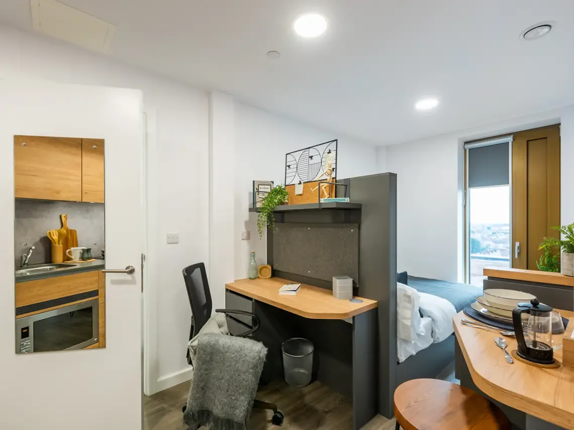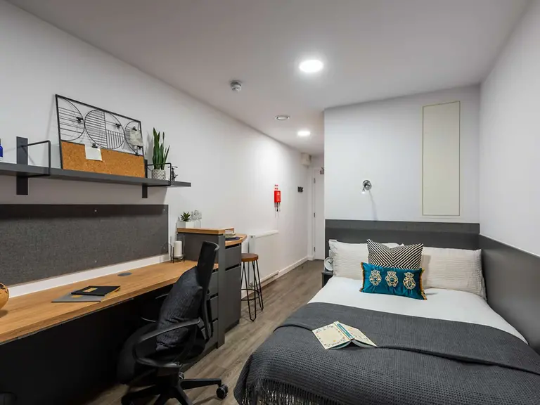 Room sizes range from 16.8m² to 17.4m² 2 ring hob Dual function electric and microwave oven Integrated fridge with freezer compartment Private ensuite bathroom with shower and WC 3/4 double bed with under bed storage Double action black out blind Double wardrobe Full length mirror Study desk and chair with drawer space USB Ports Bookshelf storage Coat hooks Integrated bedside lamp Pinboard / message board Unique in-room personal WiFi Rooms are situated from the 6th to 10th floor with stunning views over the city