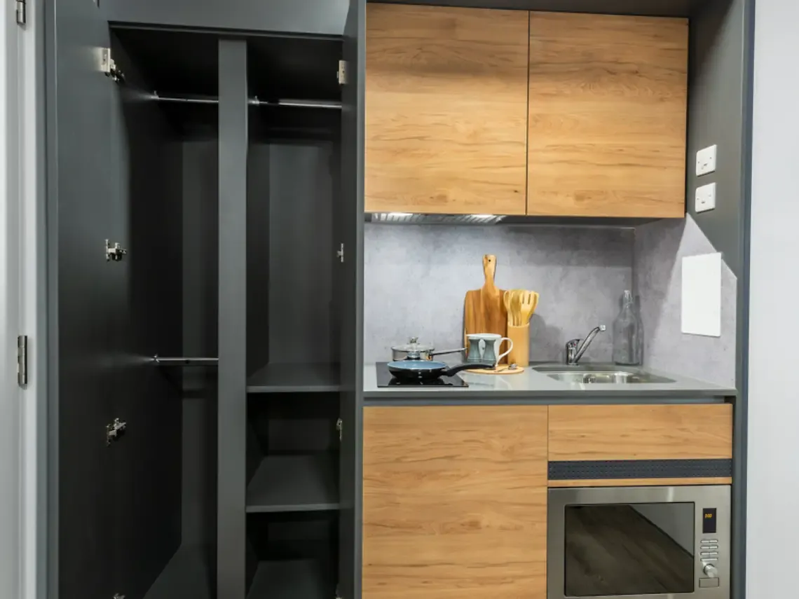 Room sizes range from 19.6m² to 21.4m² 2 ring hob Dual function electric and microwave oven Integrated fridge with freezer compartment Private ensuite bathroom with shower and WC 3/4 double bed with under bed storage Double action black out blind Double wardrobe Full length mirror Study desk and chair with drawer space USB Ports Bookshelf storage Coat hooks Integrated bedside lamp Pinboard / message board Unique in-room personal WiFi