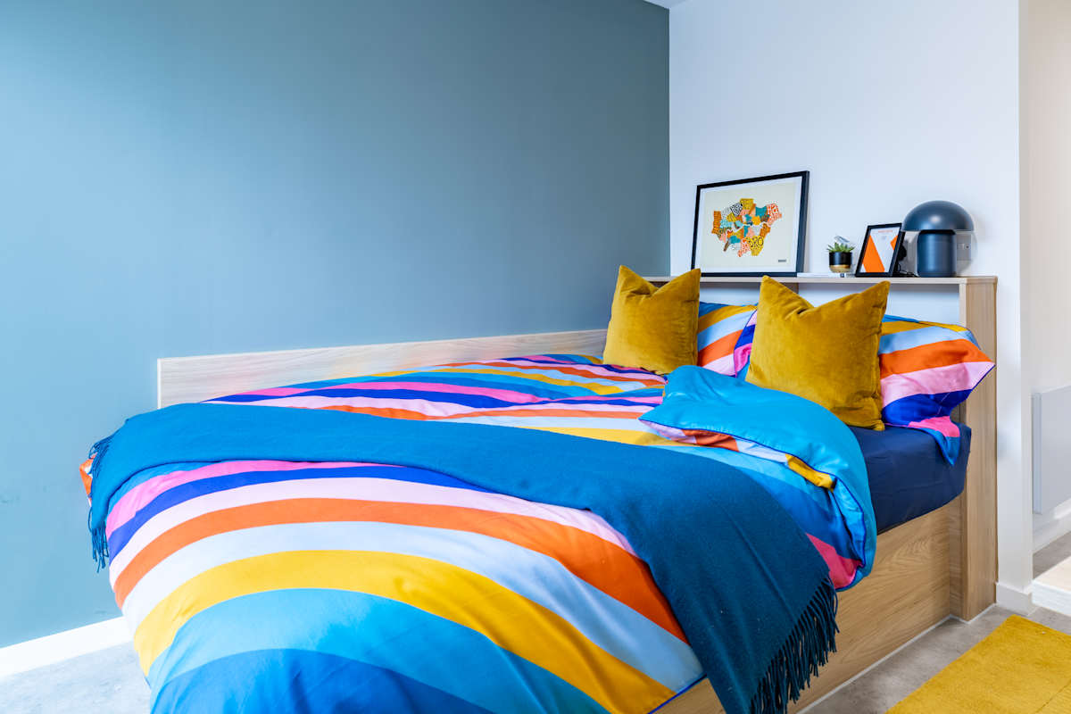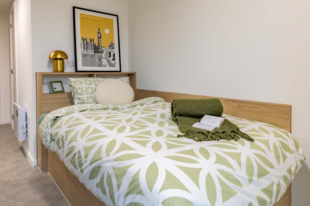 Your own private space with everything you need to live and study in comfort. Enjoy a comfy standard double bed, floor-to-ceiling wardrobes, a full-length mirror, a modern kitchen diner with hob, microwave and fridge freezer, plus a dining table and chair, ana d study area with oak desk and desk chair, and an en suite bathroom with shower, floating toilet and sink, a shaving point and mirror-fronted cupboard -perfect for luxury independent living. Situated on floor 1.