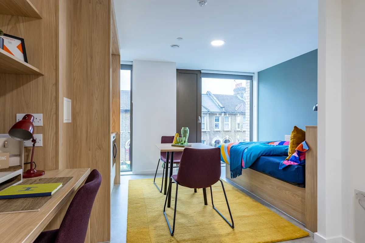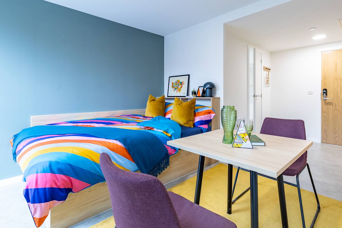 Everything you get with a classic studio, but with a larger layout and situated on floor 3. Enjoy a comfy standard double bed, floor-to-ceiling wardrobes, full-length mirror, modern kitchen diner with hob, microwave and fridge freezer plus a dining table and chairs and study area with oak desk and desk chair, and en suite bathroom with shower, floating toilet and sink, a shaving point and mirror-fronted cupboard!
