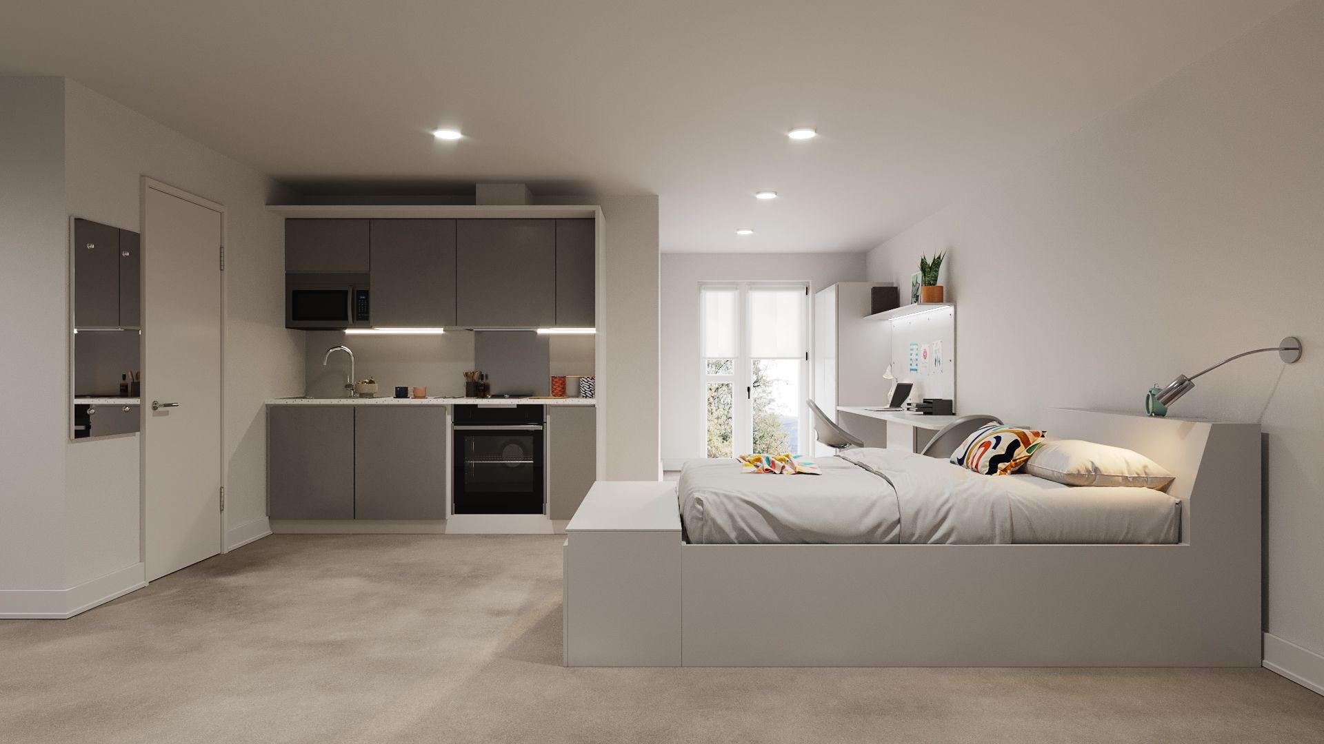 In addition to a bed with a bedside shelf and under-bed storage, View Studiosstudent accommodation offers a wardrobe, drawers, coat hooks, a study space with a desk and chair, a bookshelf, and a noticeboard, all studios are self-contained apartments with Wi-Fi and an electric heater.