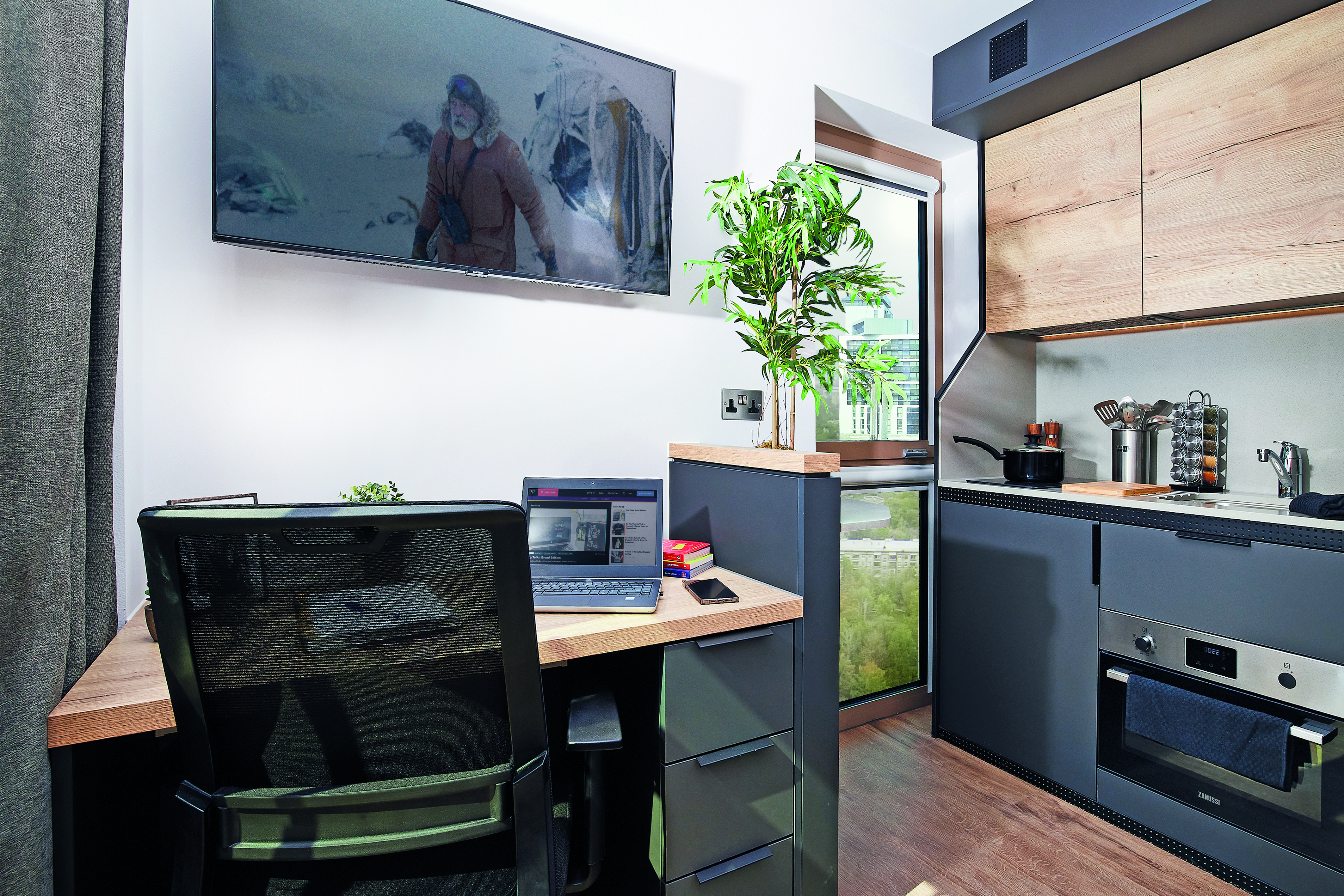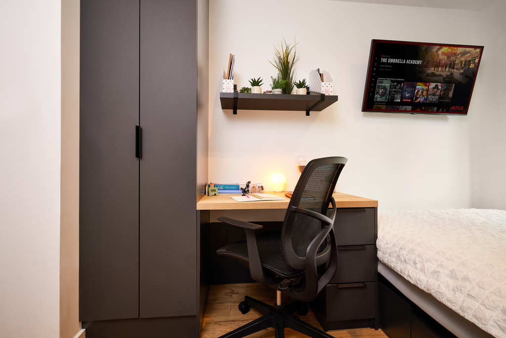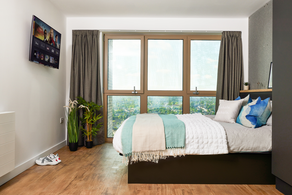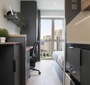 Private bathroom Small double bed (appr. 125cm*190cm) Shared kitchen1 bed in your room Your own studio, plus social space to share with up to 6 others. Offers 12sqm of living space, with your own ensuite and working area, a King Size bed, and additional storage space. Prices may vary as per the floor level.