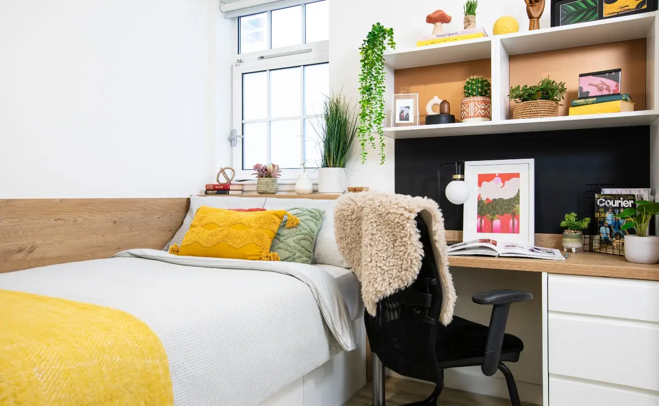 A 19m² self-contained twin studio with two comfy beds with under-bed storage, a study desk with a chair, an en-suite bathroom shared with your roommate, and a fully fitted kitchenette with cooking hobs, microwave, oven, hob, and fridge/freezer.