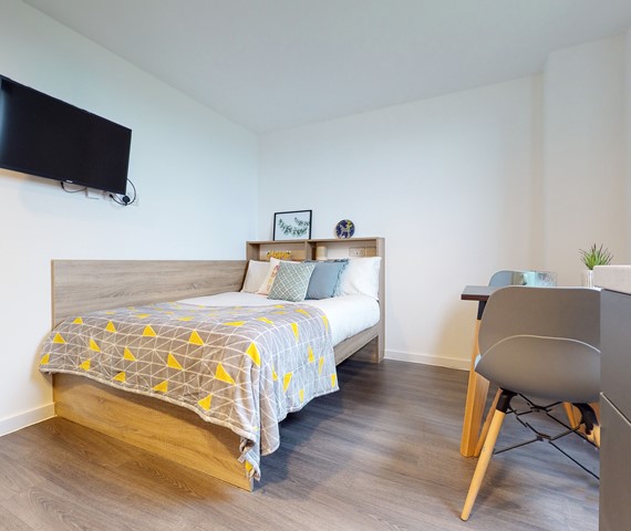 Studios are approximately 16 - 28 SQM in size. These student rooms come with a bed, ensuite bathroom, study area, storage space, and kitchenette.