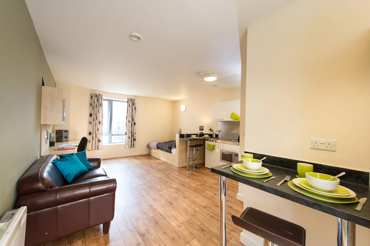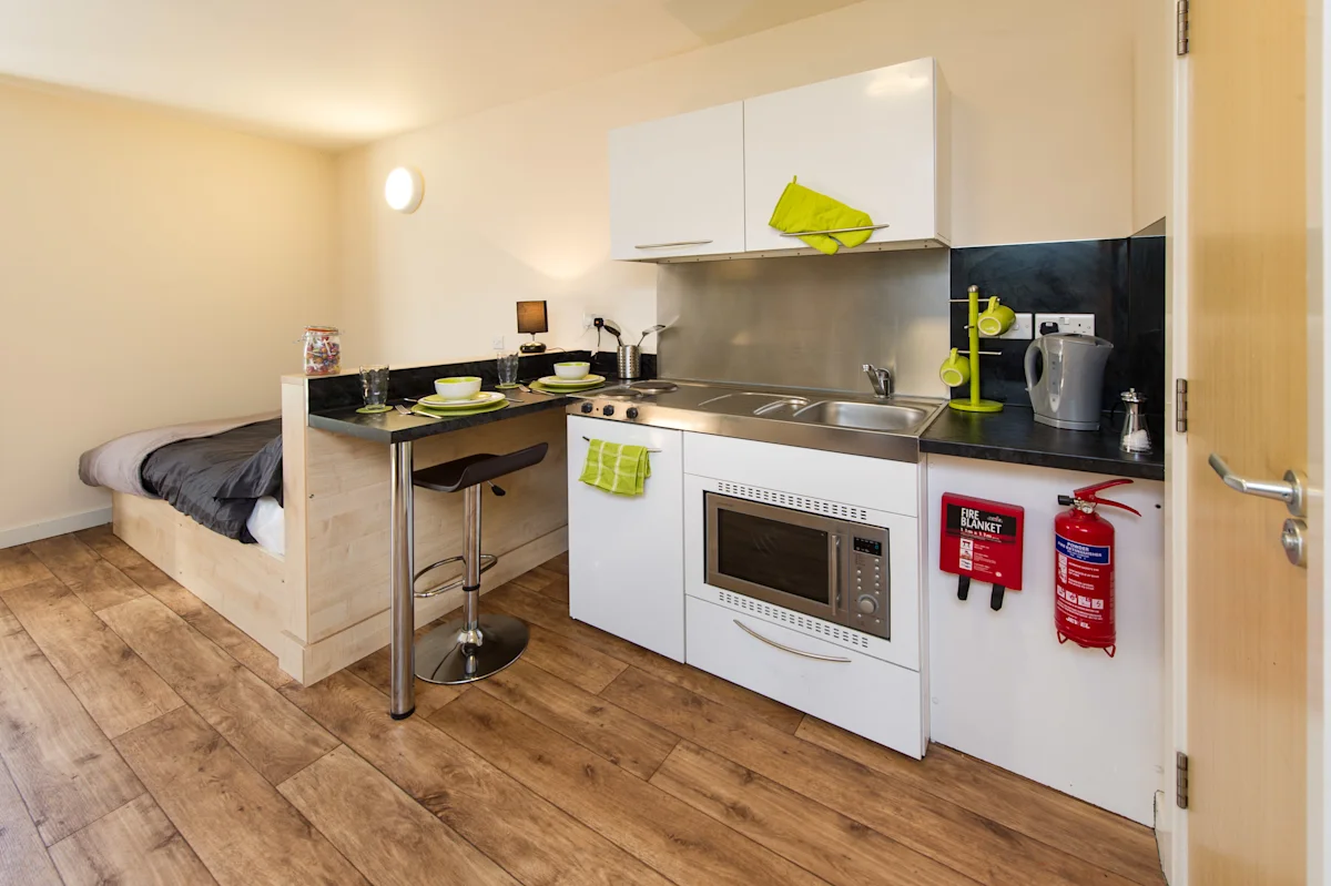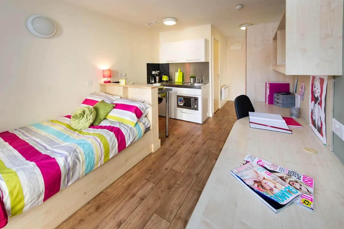 Self-contained studio. En-suite shower room, small double bed, bags of storage, fitted kitchen and study area. Dual occupancy available for no extra charge! Rooms approx. 18m2.