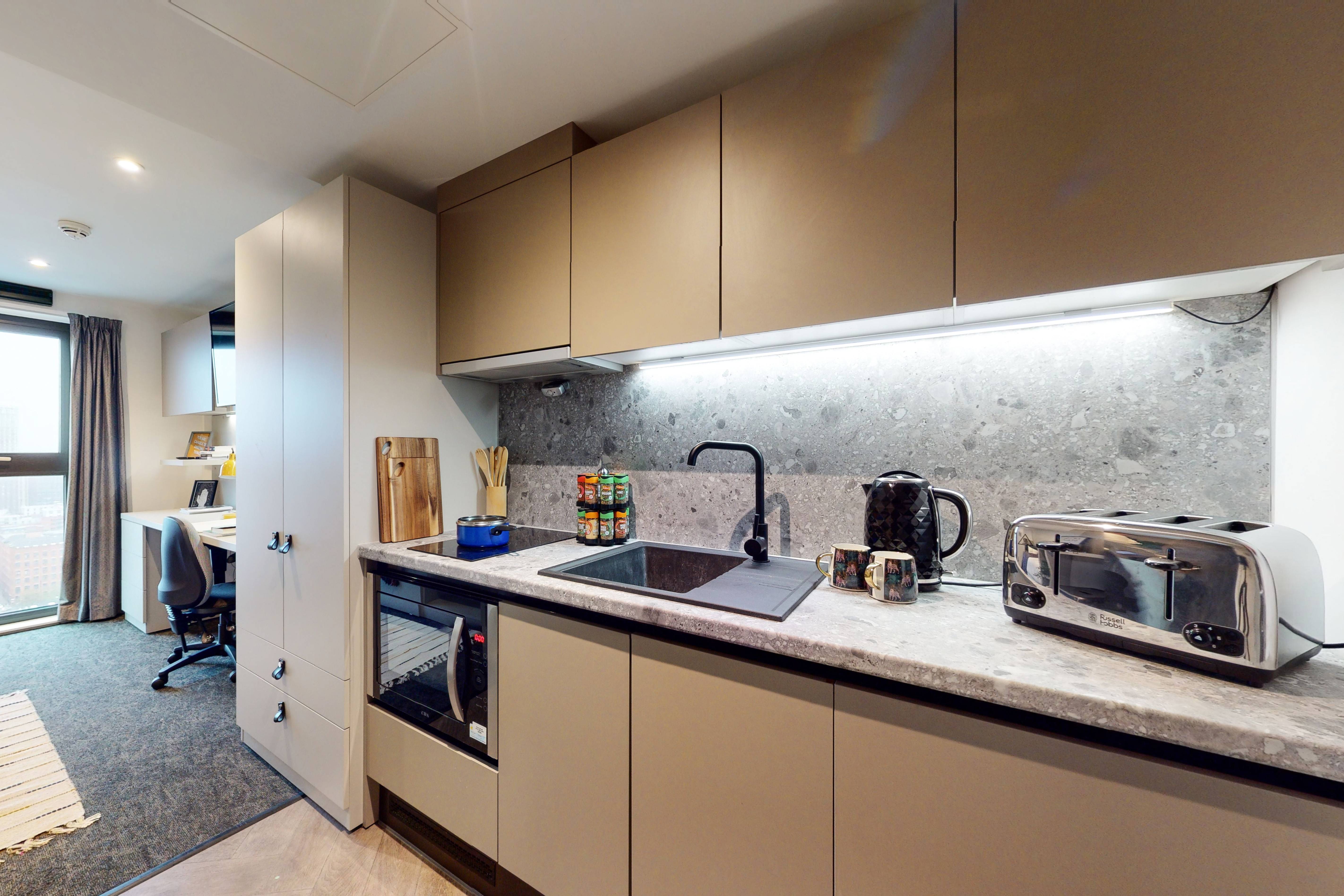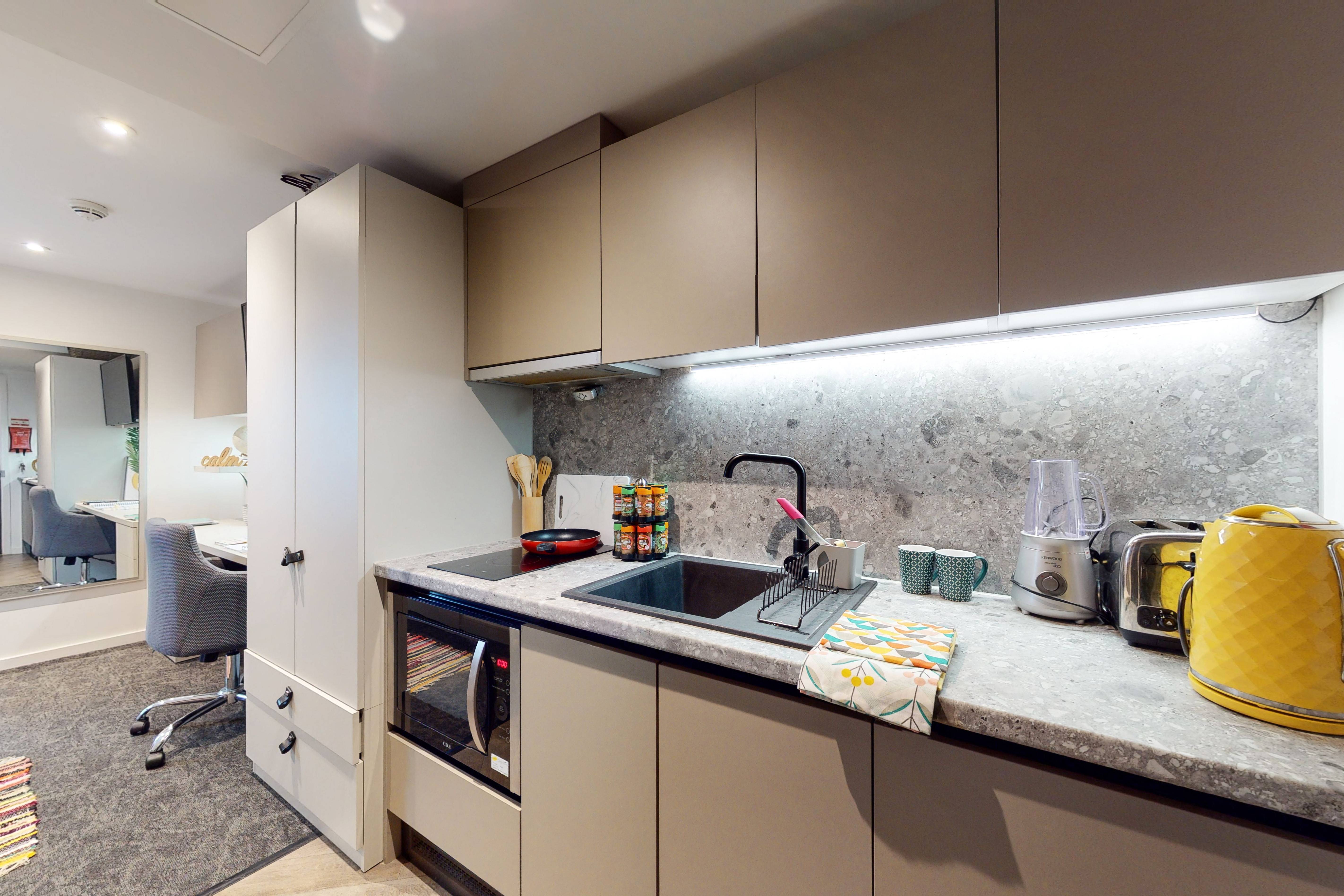 Bills included, Private room, 20 - 21 sqm, Study desk & chair, Wardrobe & additional storage space, Private kitchen with cooking facilities, fridge/freezer & sink, Private bathroom with shower, toilet & basin