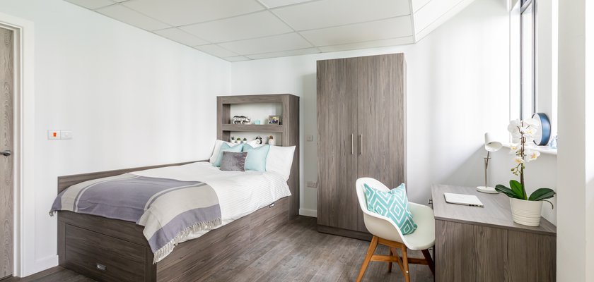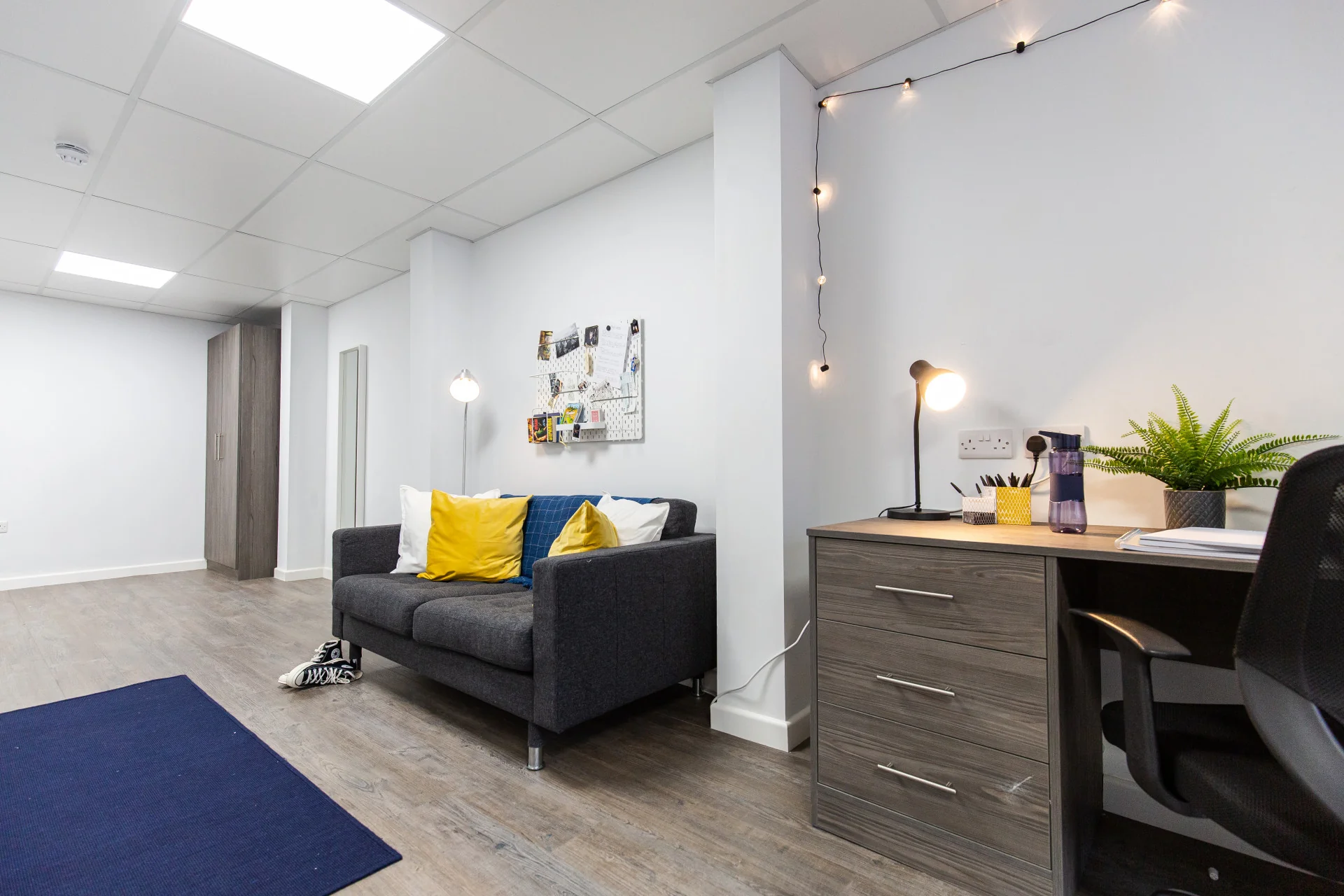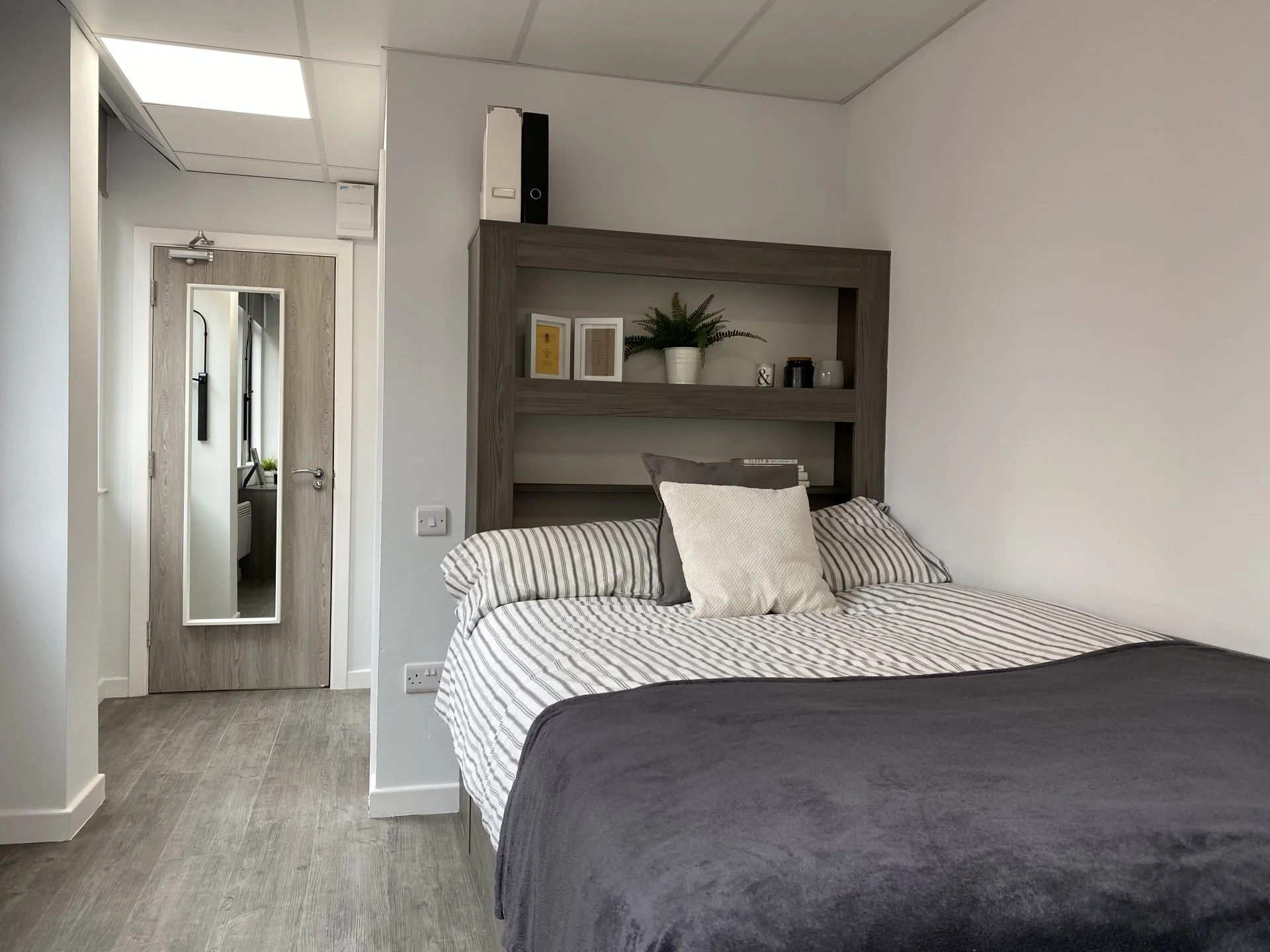 All rooms are en-suite with a newly fitted modern bathrooms, Each cluster has a large kitchen equipped with 2 hobs and ovens and plenty of fridge and freezer space. There is also a large lounge, with a 50 inch TV a huge corner sofa. There is also an additional common area located on the ground floor for use of all tenants. This means there is plenty of space to relax outside of your room. Features En suite bathroom Bed with storage underneath Large wardrobe Study desk Large shared kitchen Kitchen fully equipped with kitchen appliances, such as 2 ovens, 2 toasters, 2 kettles etc. Large shared living area Laundry facilities Additional common room on the ground floor Indoor bike store