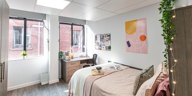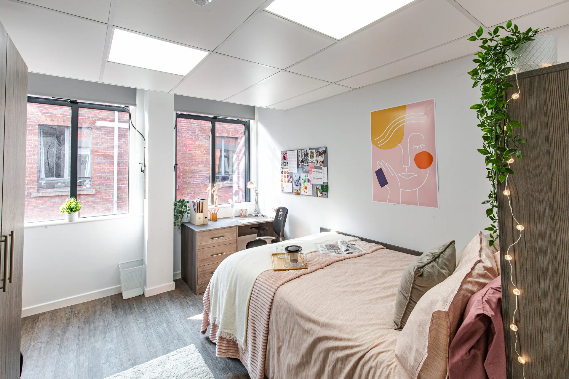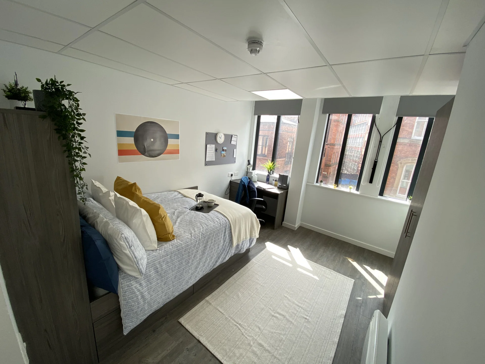 All rooms are en-suite with a newly fitted modern bathrooms, Each cluster has a large kitchen equipped with 2 hobs and ovens and plenty of fridge and freezer space. There is also a large lounge, with a 50 inch TV and a huge corner sofa. There is also an additional common area located on the ground floor for use of all tenants. This means there is plenty of space to relax outside of your room. The block is ideally located in the heart of the Northern Quarter, which is known for it’s creative and urban heart and is home to countless independent fashion stores, record shops, cafés, bars and restaurants. It also has the added benefit of being 5 minutes from the Arndale Centre, which means that all the amenities Manchester has to offer are right on your doorstep! Both the University of Manchester and Manchester Metropolitan are a short bus journey away. Features: En suite bathroom Bed with storage underneath Large wardrobe Study desk Large shared kitchen Kitchen fully equipped with kitchen appliances, such as 2 ovens, 2 toasters, 2 kettles etc. Large shared living area Laundry facilities Additional common room on the ground floor Indoor bike store