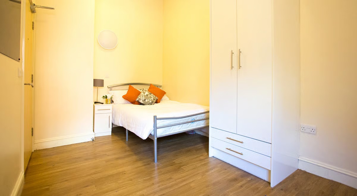 Spacious bedroom with a ¾ double bed, En-suite bathroom, study area and wardrobe. The shared area includes a lounge and kitchen area and up to 100Mbps WIFI throughout.