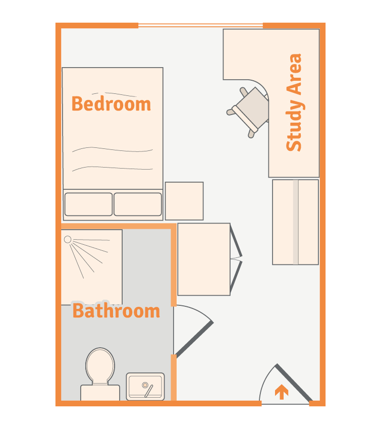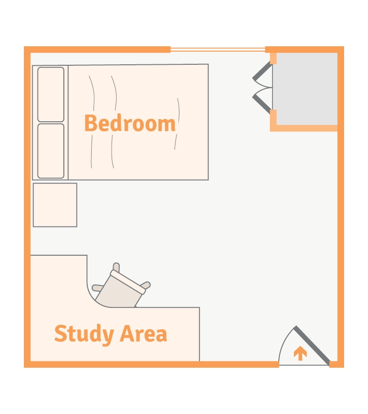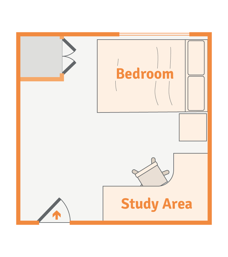 Spacious bedroom with a ¾ double bed, En-suite bathroom, study area and wardrobe. The shared area includes a lounge and kitchen area with TV and up to 100Mbps WIFI throughout.