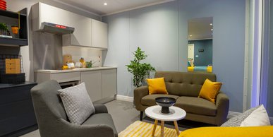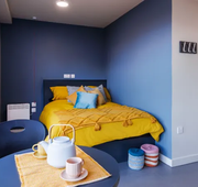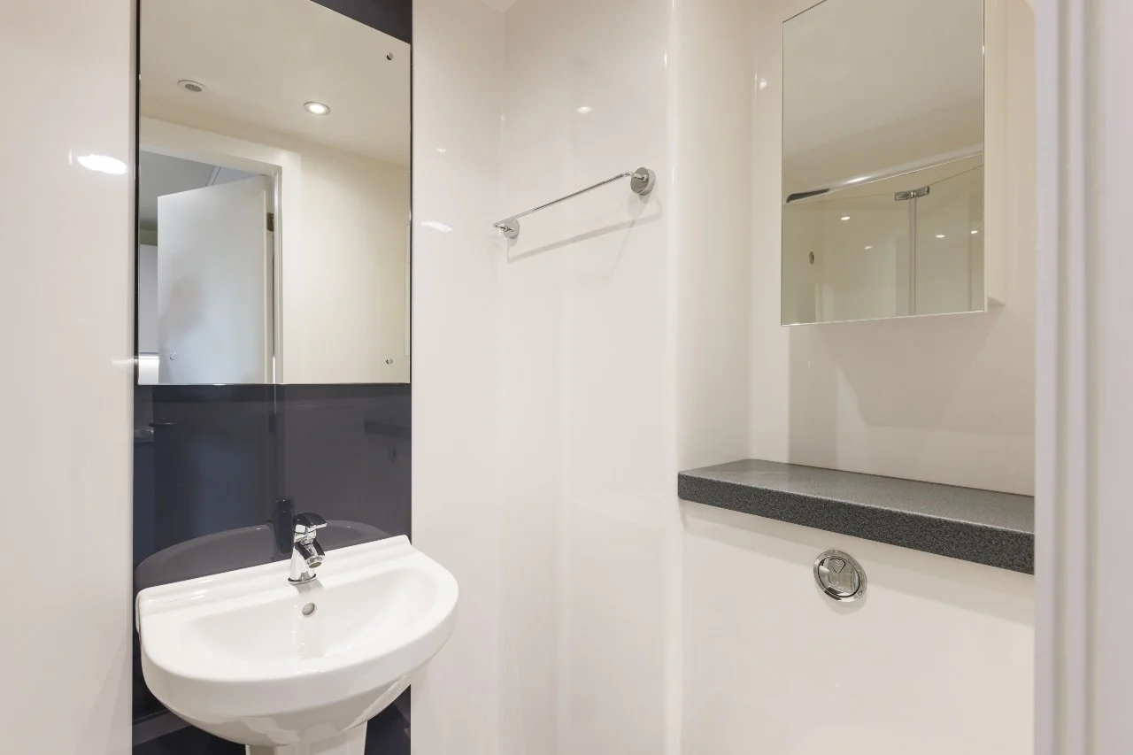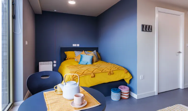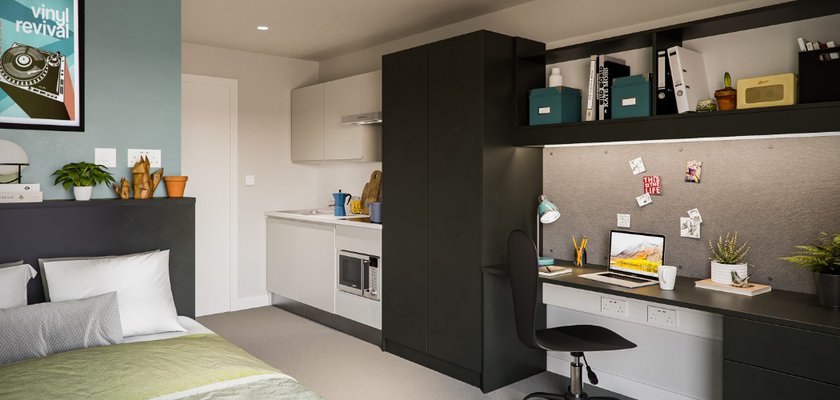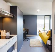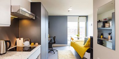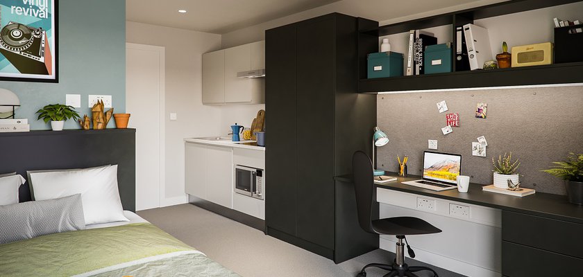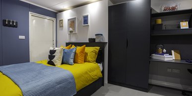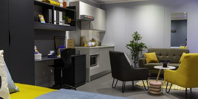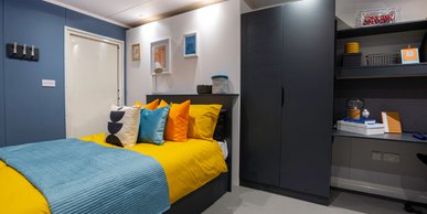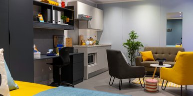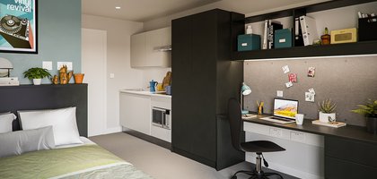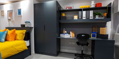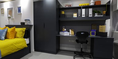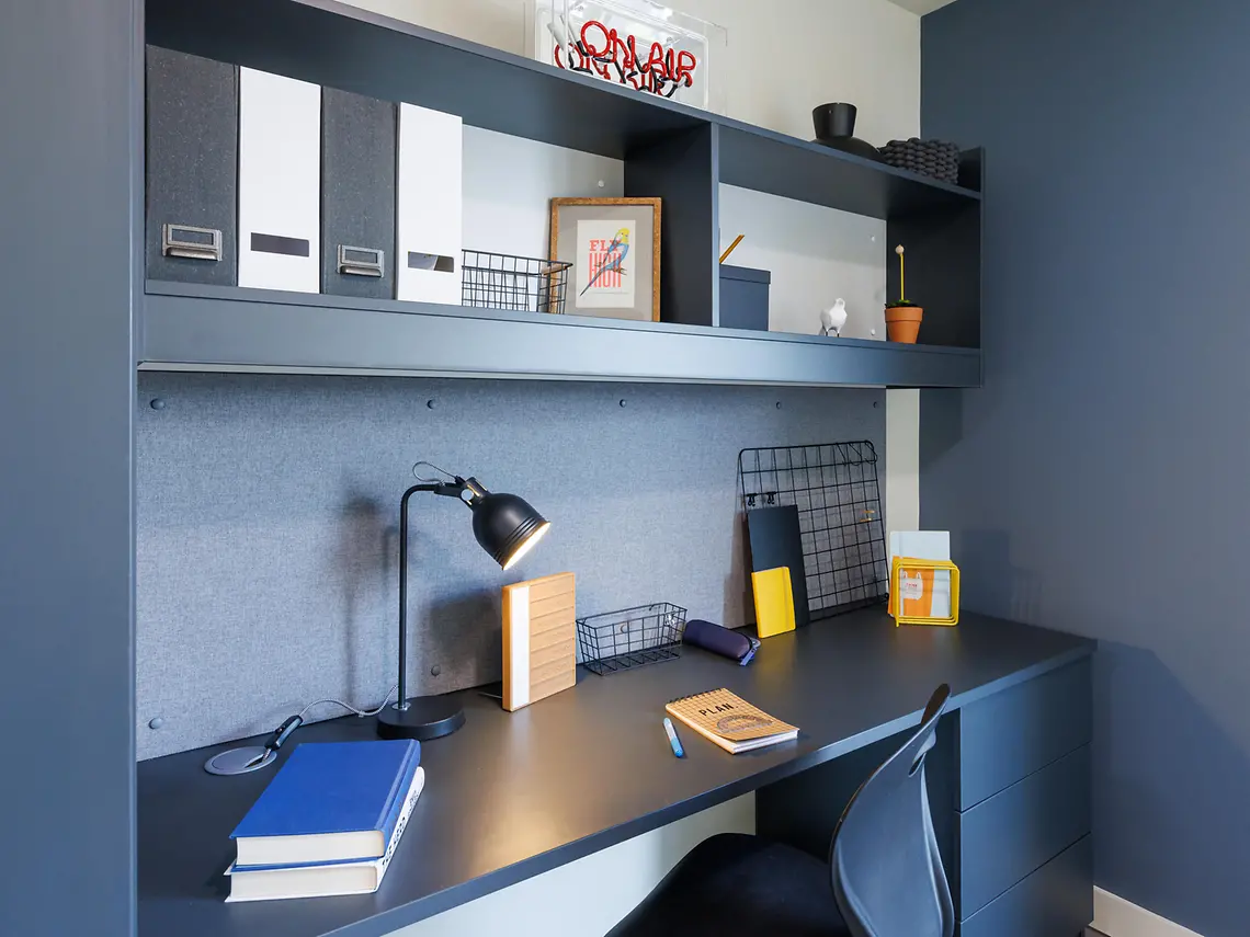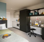 Room sizes may vary - Double bed with under bed storage - 2-ring hob with extractor - Breakfast bar - En-suite bathroom with shower and WC - Full-length mirror - Integrated fridge with freezer compartment - Combi microwave and mini grill oven - Pinboard - Stool - Study Desk with drawer space and chair - Wardrobe