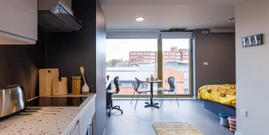 There are two different sizes of studio apartments available at Element Manchester: Standard Studios and Large Studios. A double bed with under-bed storage, an ensuite bathroom, a kitchen, a closet, and a workspace with a chair and cabinets for study are included in every room at the Element student accommodation.