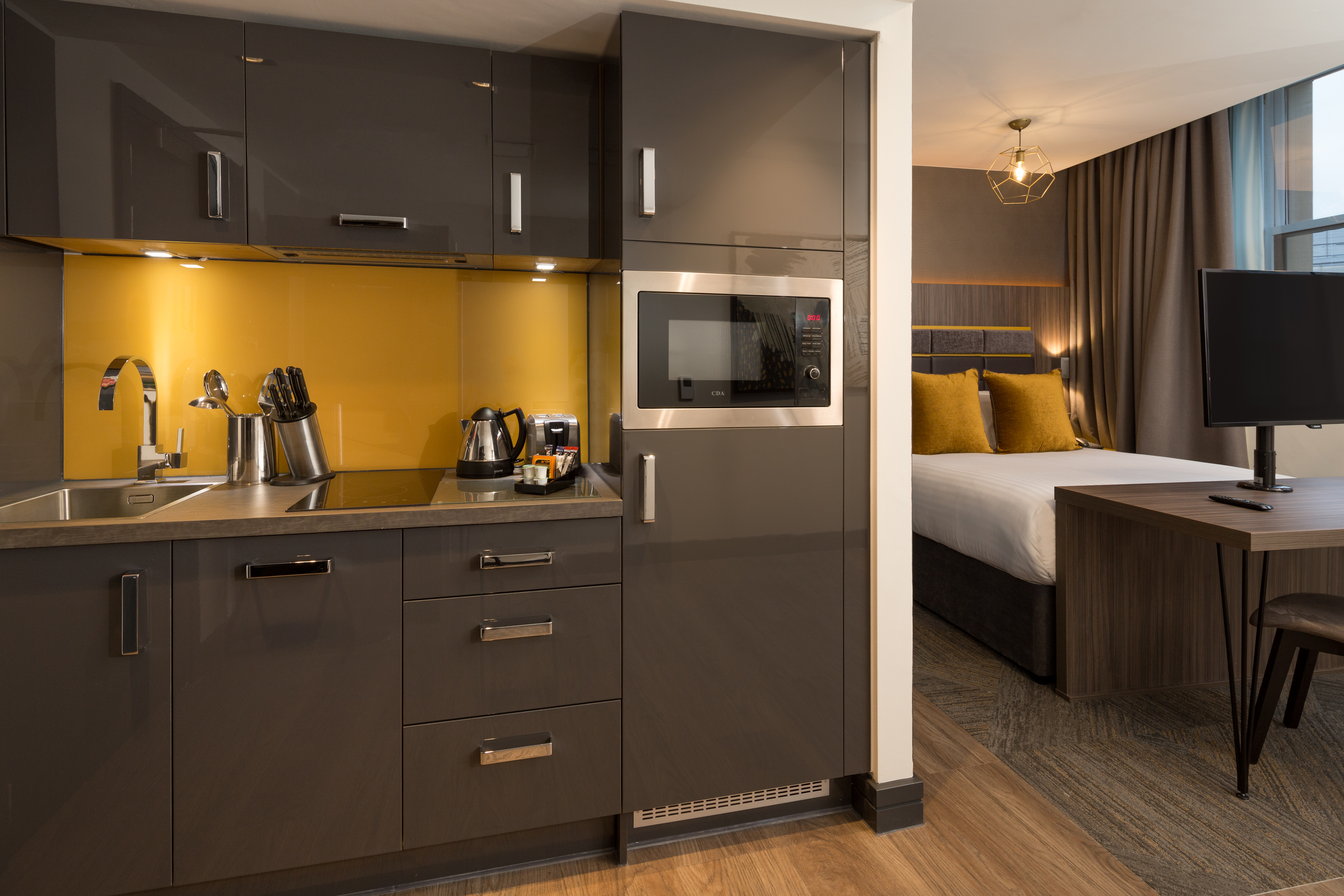 The Neo Studio (average 24m2) serviced apartment is the perfect pad for you. Combining a stylish hotel room with luxurious ensuite bathroom, a full kitchenette, sofa and workspace, ideal for your student living.