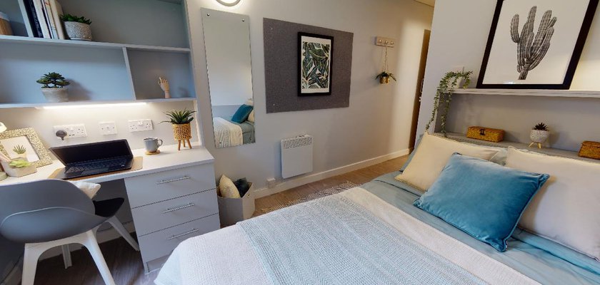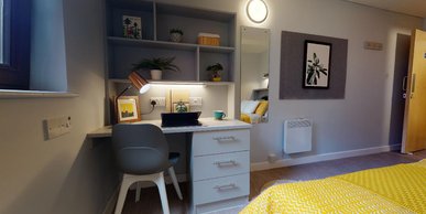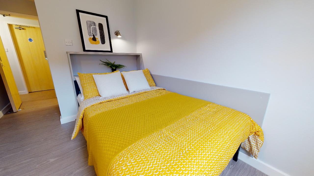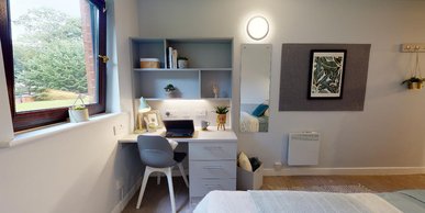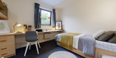 This newly refurbished room is equipped with a small double bed, study desk and chair, storage and an en suite shower room – all you need to settle into student life.