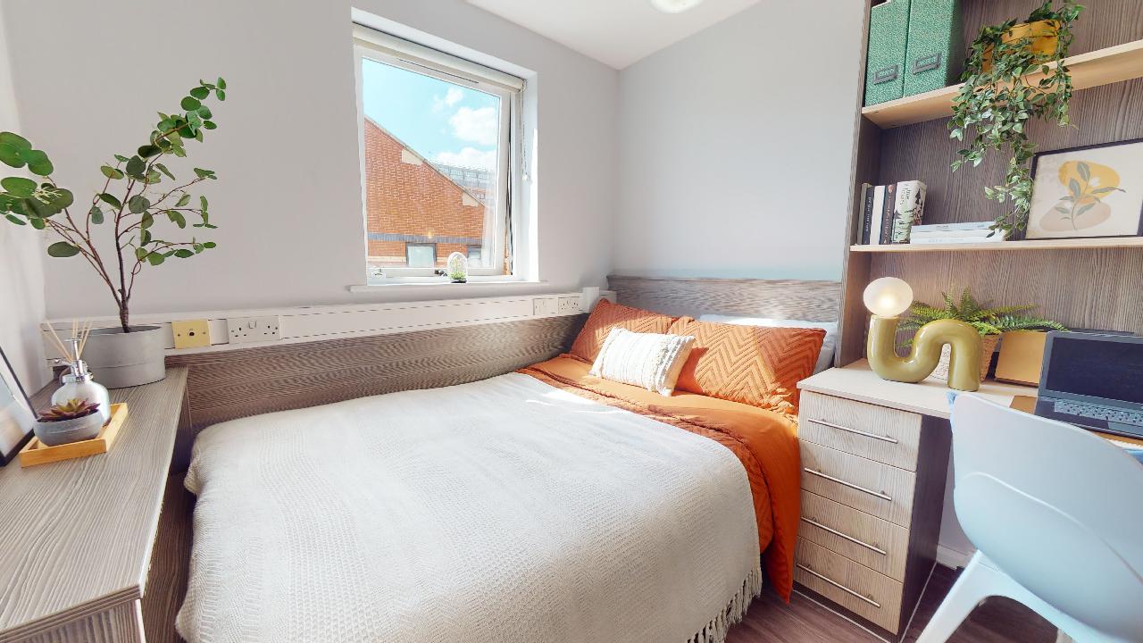 LAMB300-081125With a little extra bedroom space than our Bronze Three Bed Apartments, these rooms are perfect for three friends sharing with their communal kitchen, bathroom and living space. Your bedroom comes with double bed, study area and lots of storage. You and your housemates will be sharing your spacious living area with sofas, bathroom and well-equipped kitchen and you’ll also benefit from the building’s bowling alley, cinema, gym, laundry and karaoke and games room.
