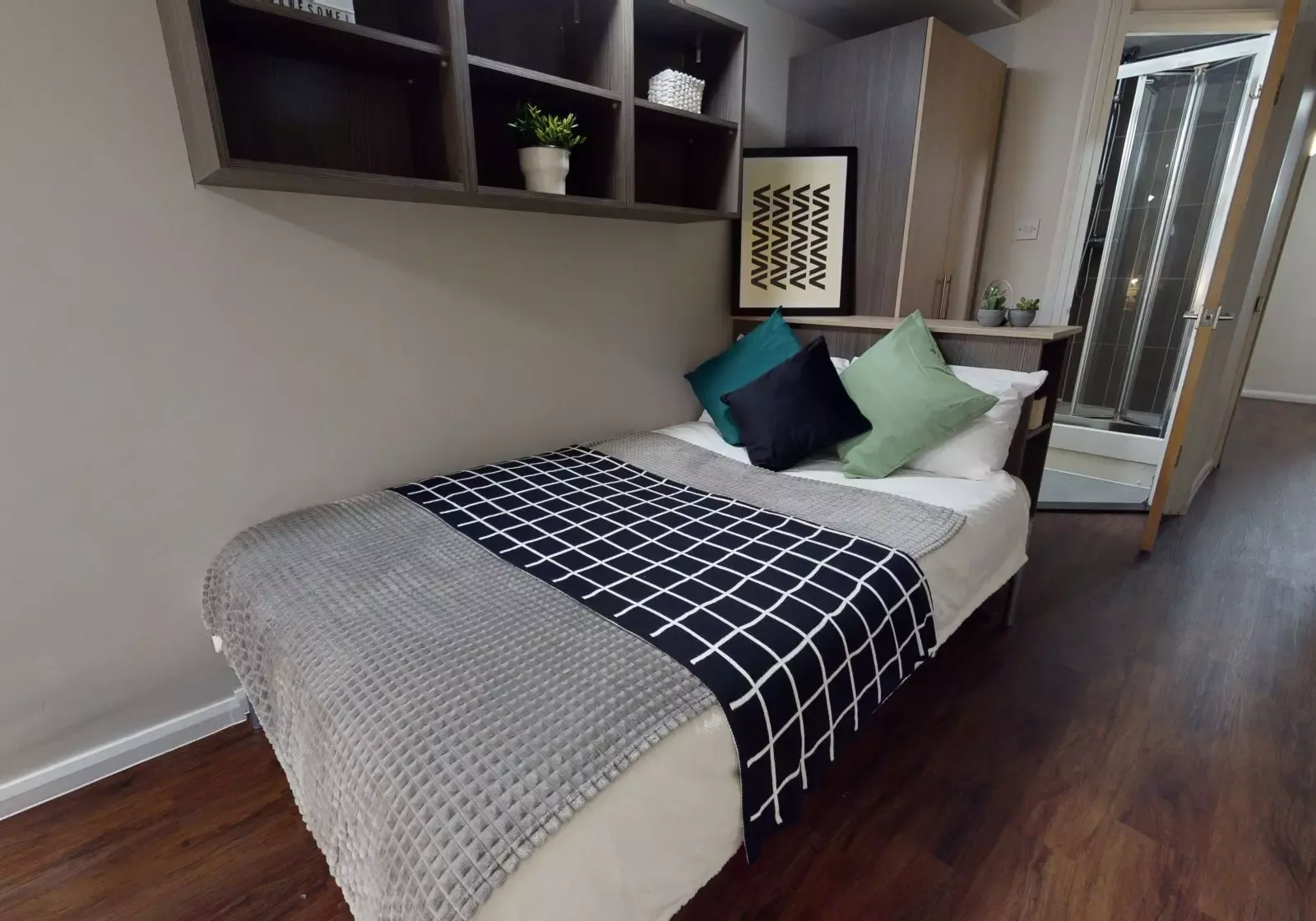 LAMB200-031125Our 11 sq m Gold En Suite rooms benefit from sharing their kitchen and living room with just four other flatmates. These rooms come with small double bed, lots of storage and study area and share a stylish and kitchen living space with up to 4 other rooms. This excellent social atmosphere combines with building perks like a bowling alley, cinema, gym, laundry and karaoke and games room.